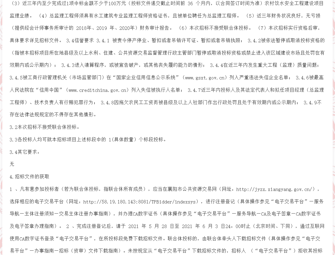 | 1 、凡有意参加投标者(若为联合体投标,指联合体所有成员),应当在襄阳市公共资源交易网(网址:http://jyzx.xiangyang.gov.cn/),选择相应的电子交易平台(网址:http://58.19.180.143:8081/TPBidder/indexsys),进行注册登记(具体操作参见“电子交易平台”—服务导航—主体注册须知—交易主体注册办事指南),并办理CA数字证书(具体操作参见“电子交易平台”—服务导航—CA及电子签章—CA数字证书及电子签章办理指南)。 2 、完成注册登记后,请于 2021 年 5 月 28 日至 2021 年 6 月 3 日24:00时止(北京时间、下同),通过互联网使用CA数字证书登录“电子交易平台”,在所投标段免费下载招标文件。联合体投标的,由联合体牵头人下载招标文件(具体操作参见“电子交易平台”—办事指南—招标(资审)文件下载指南)。未按规定从“电子交易平台”下载招标文件的,招标人 (“电子交易平台”)拒收其投标文件。 | |||||||||||||||||||||
