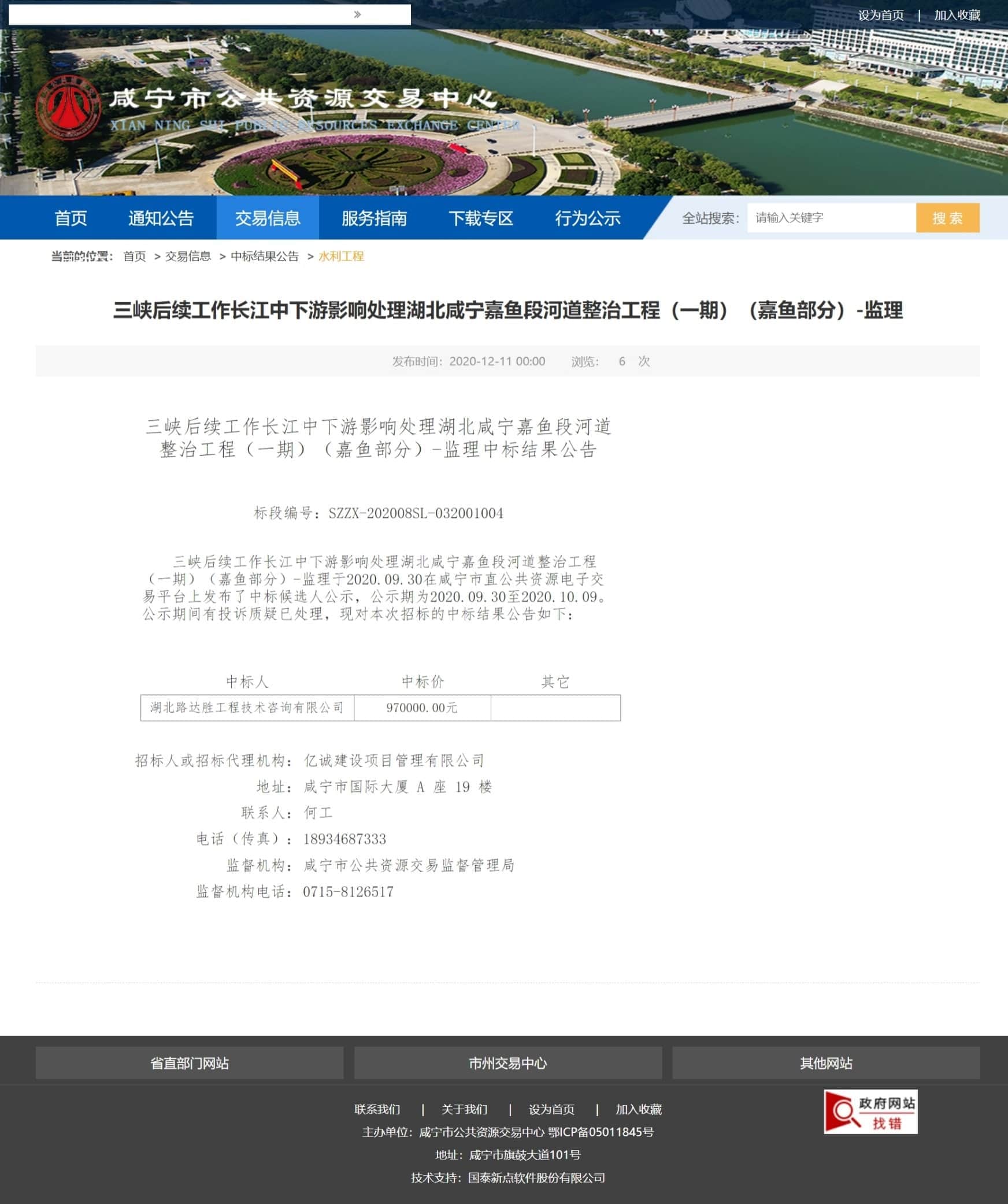 后续工作长江中下游影响处理湖北咸宁嘉鱼段河道整治工程(一期)(嘉鱼部分)-监理于2020.09.30在咸宁市直公共资源电子交易平台上发布了中标候选人公示,公示期为2020.09.30至2020.10.09。公示期间有投诉质疑已处理,现对本次招标的中标结果公告如下: