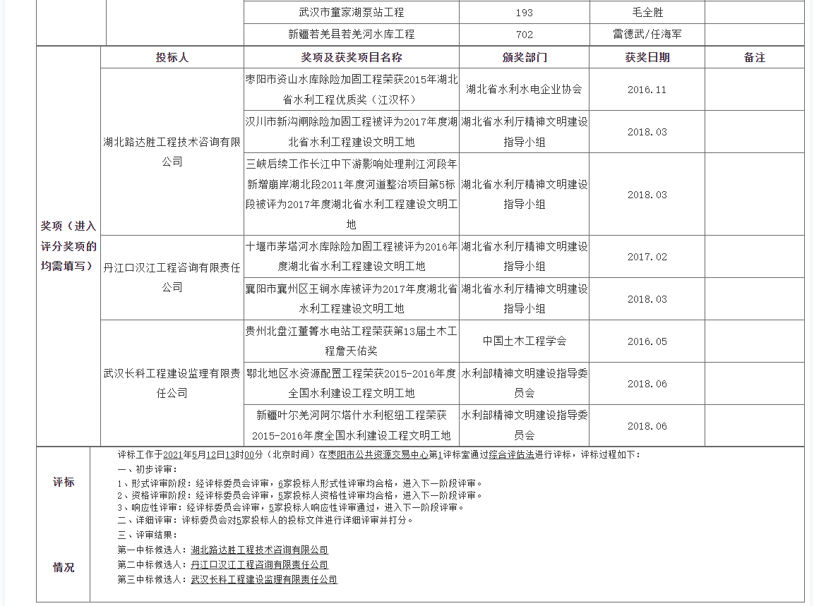 评标工作于2021年5月12日13时00分(北京时间)在枣阳市公共资源交易中心第1评标室通过综合评估法进行评标,评标过程如下: