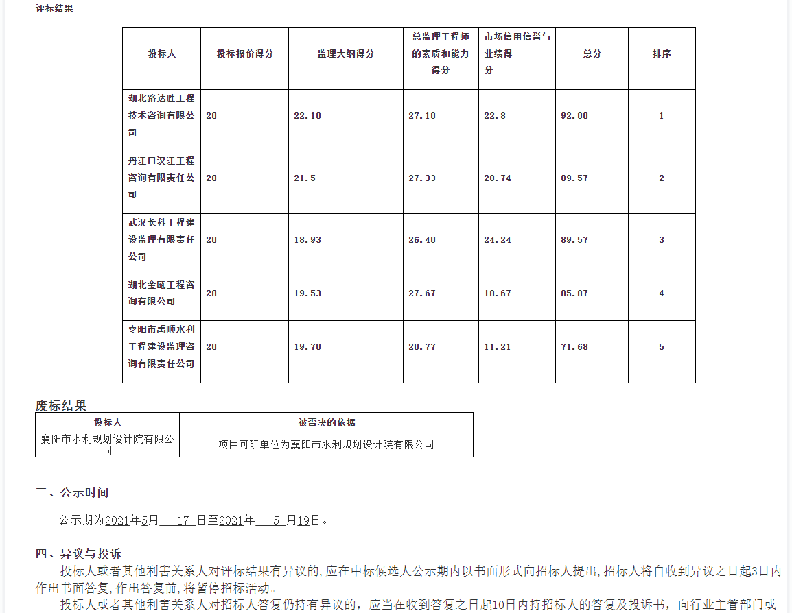 枣阳市2020年农村饮水安全工程第四标段于2021年4月15日在湖北公共资源交易电子服务系统、襄阳市人民政府网、襄阳市公共资源交易网发布招标公告,2021年5月12日9时30分在枣阳市公共资源交易中心1号开标室开标,并于2021年5月12日完成评标 ,根据评标委员会提交的评标报告,枣阳市水利工程建设项目办公室已经确认评标结果,现将中标候选人公示如下: 二、评标结果