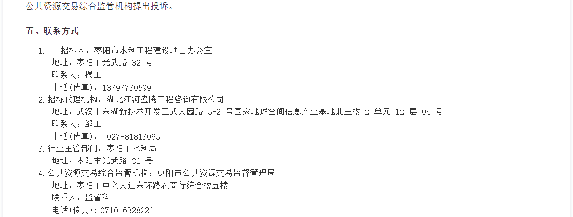 地址:枣阳市光武路 32 号 4.公共资源交易综合监管机构:枣阳市公共资源交易监督管理局