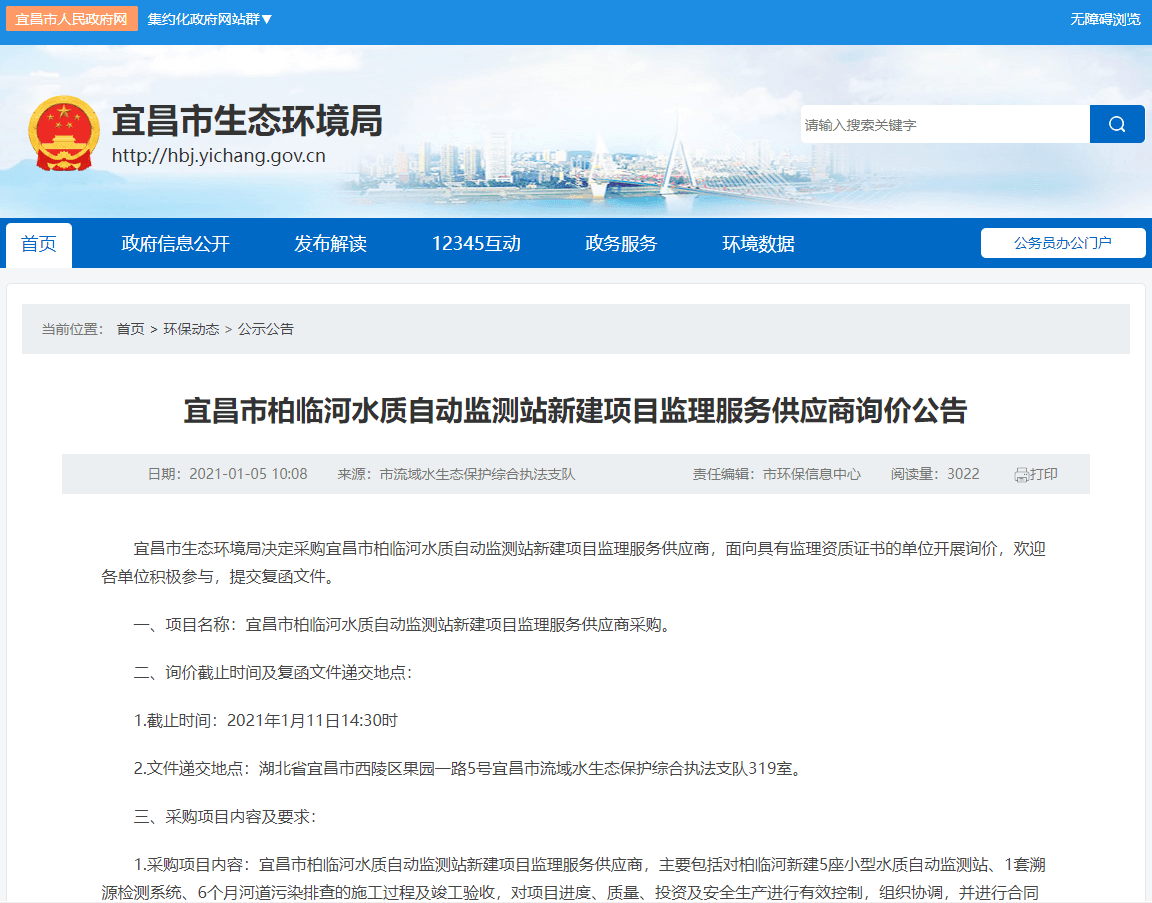 宜昌市生态环境局决定采购宜昌市柏临河水质自动监测站新建项目监理服务供应商,面向具有监理资质证书的单位开展询价,欢迎各单位积极参与,提交复函文件。