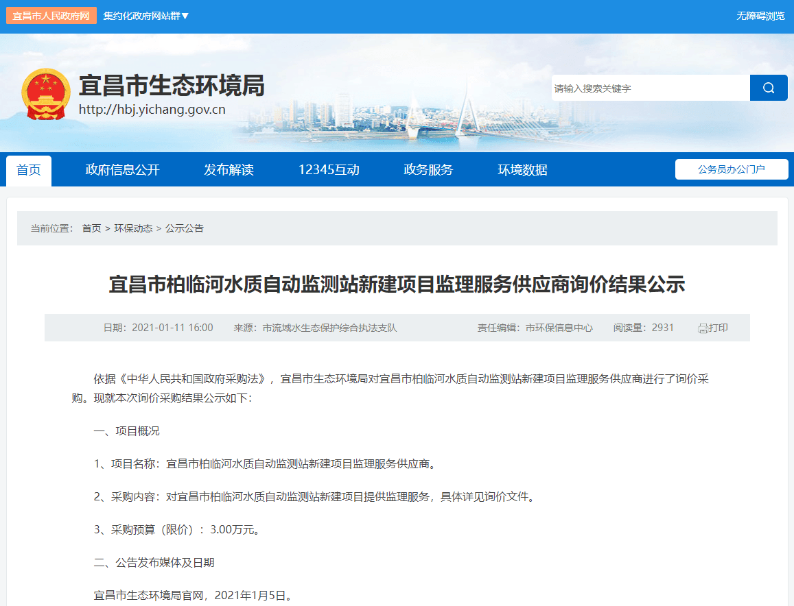 依据《中华人民共和国政府采购法》,宜昌市生态环境局对宜昌市柏临河水质自动监测站新建项目监理服务供应商进行了询价采购。现就本次询价采购结果公示如下: