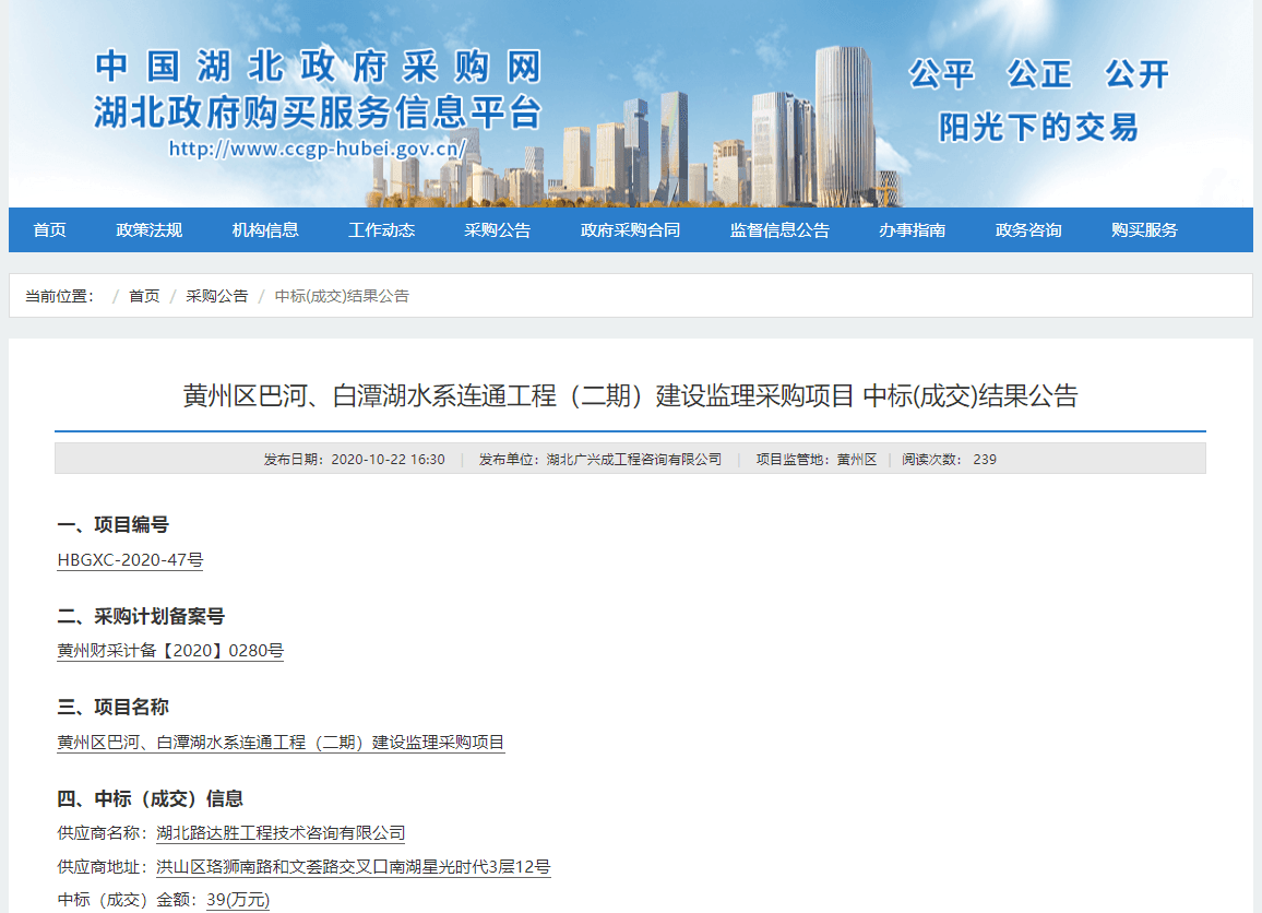 黄州区巴河、白潭湖水系连通工程(二期)建设监理采购项目