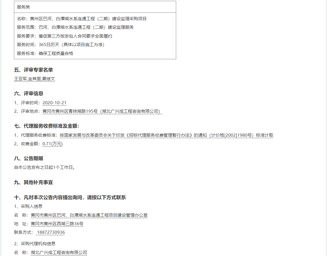 名称:黄州区巴河、白潭湖水系连通工程(二期)建设监理采购项目 服务范围:巴河、白潭湖水系连通工程(二期)建设监理服务 服务要求:督促第三方按发包人合同要求全面履约 服务时间:365日历天(具体以项目施工为准) 服务标准:确保工程质量合格 |