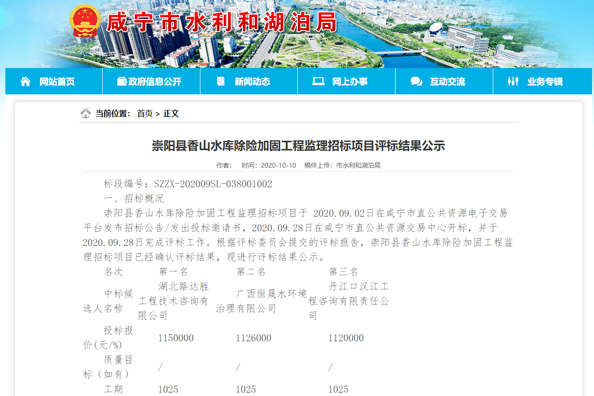 崇阳县香山水库除险加固工程监理招标项目于 2020.09.02日在咸宁市直公共资源电子交易平台发布招标公告/发出投标邀请书,2020.09.28日在咸宁市直公共资源交易中心开标,并于2020.09.28日完成评标工作。根据评标委员会提交的评标报告,崇阳县香山水库除险加固工程监理招标项目已经确认评标结果,现进行评标结果公示。