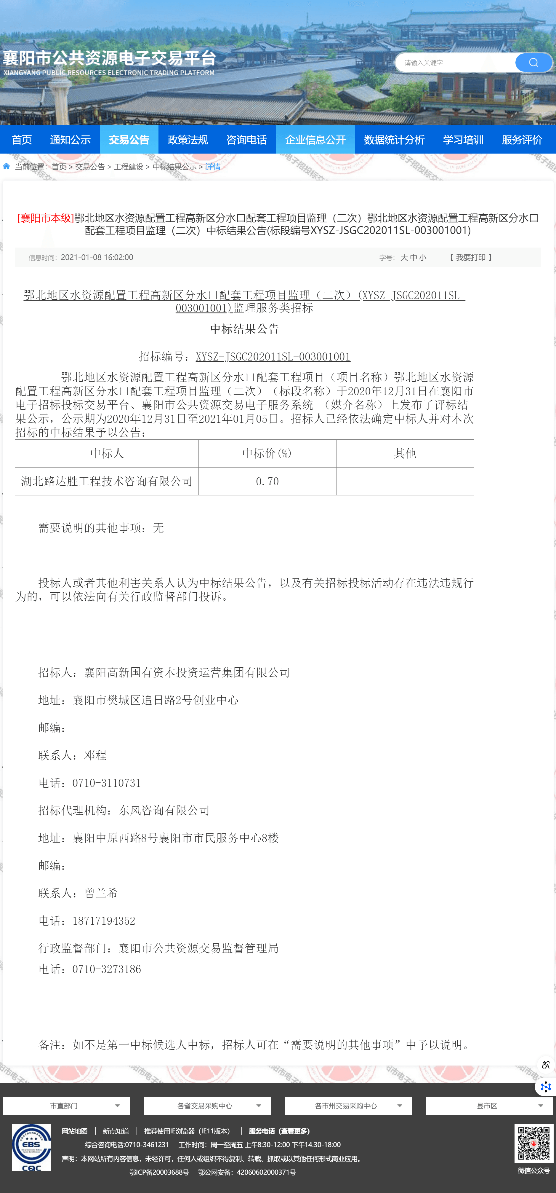 | 行政监督部门:襄阳市公共资源交易监督管理局 | |||||||