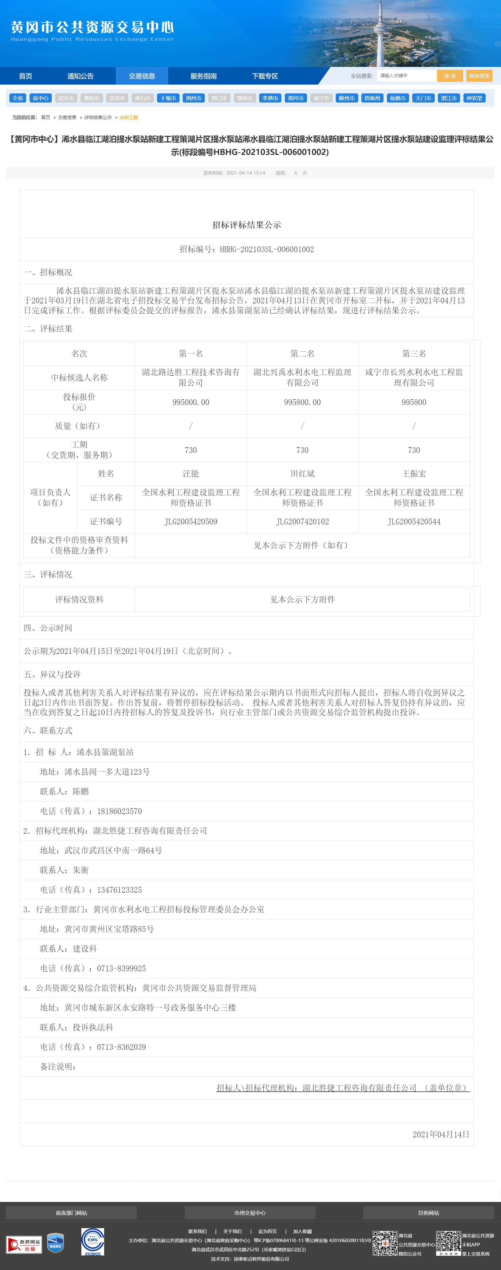 浠水县临江湖泊提水泵站新建工程策湖片区提水泵站浠水县临江湖泊提水泵站新建工程策湖片区提水泵站建设监理于2021年03月19日在湖北省电子招投标交易平台发布招标公告,2021年04月13日在黄冈市开标室二开标,并于2021年04月13日完成评标工作。根据评标委员会提交的评标报告,浠水县策湖泵站已经确认评标结果,现进行评标结果公示。