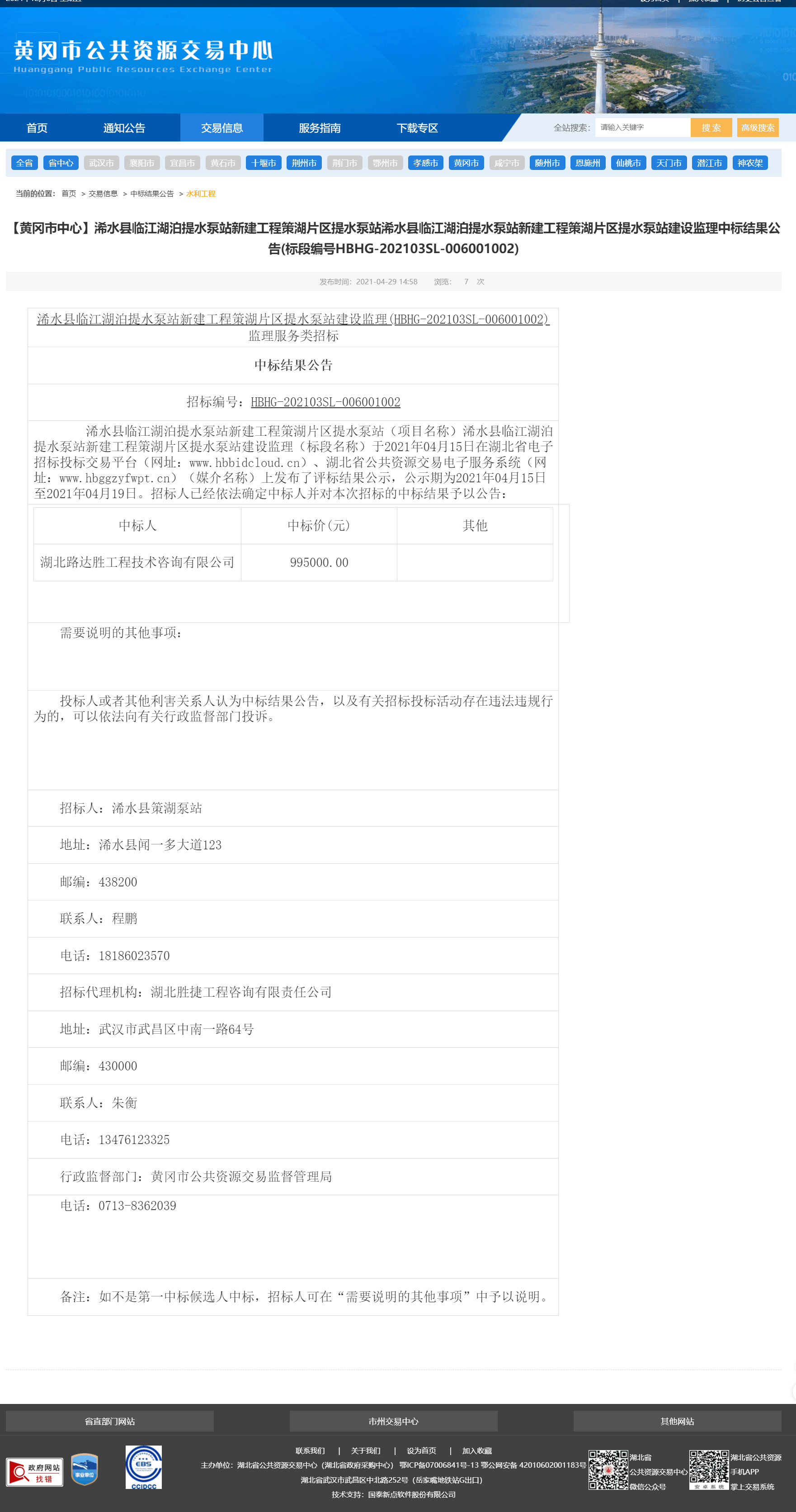 浠水县临江湖泊提水泵站新建工程策湖片区提水泵站(项目名称)浠水县临江湖泊提水泵站新建工程策湖片区提水泵站建设监理(标段名称)于2021年04月15日在湖北省电子招标投标交易平台(网址:www.hbbidcloud.cn)、湖北省公共资源交易电子服务系统(网址:www.hbggzyfwpt.cn)(媒介名称)上发布了评标结果公示,公示期为2021年04月15日至2021年04月19日。招标人已经依法确定中标人并对本次招标的中标结果予以公告: