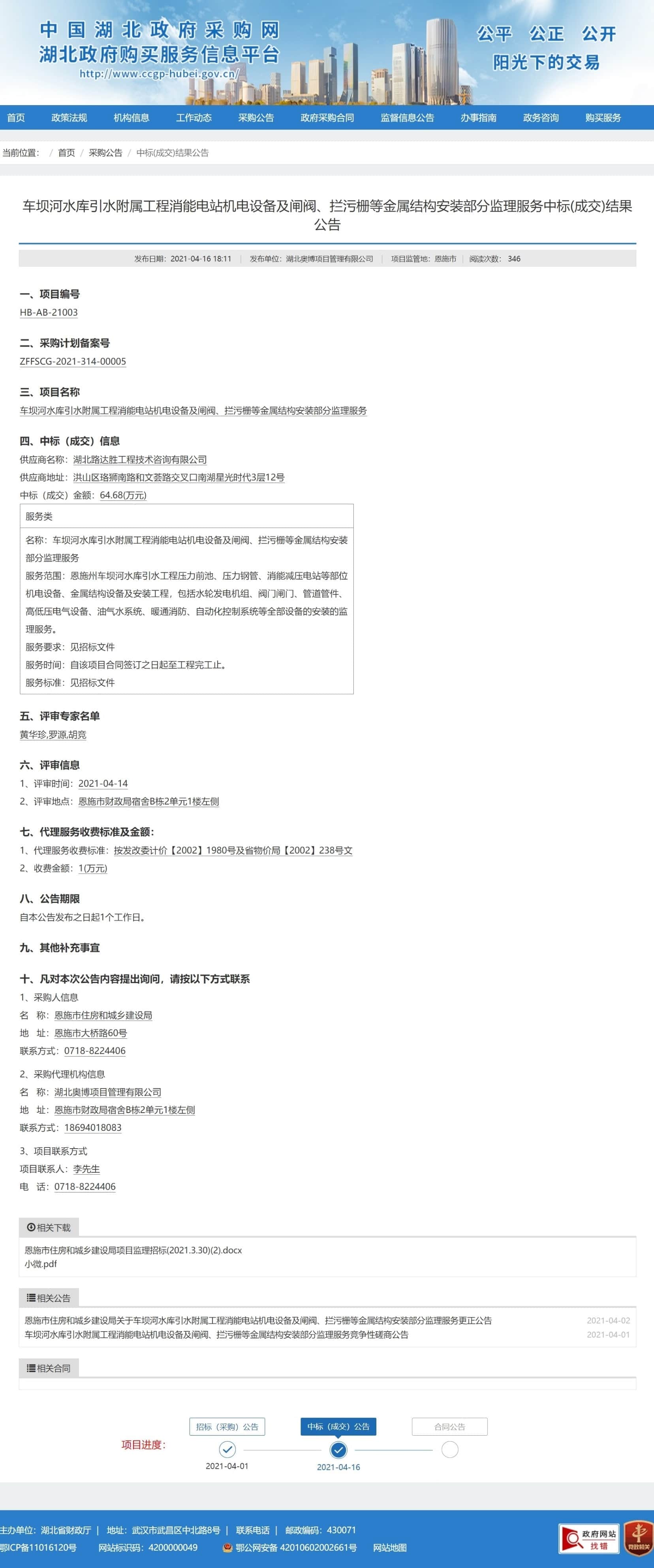 名称:车坝河水库引水附属工程消能电站机电设备及闸阀、拦污栅等金属结构安装部分监理服务 服务范围:恩施州车坝河水库引水工程压力前池、压力钢管、消能减压电站等部位机电设备、金属结构设备及安装工程,包括水轮发电机组、阀门闸门、管道管件、高低压电气设备、油气水系统、暖通消防、自动化控制系统等全部设备的安装的监理服务。 服务要求:见招标文件 服务时间:自该项目合同签订之日起至工程完工止。 服务标准:见招标文件 |