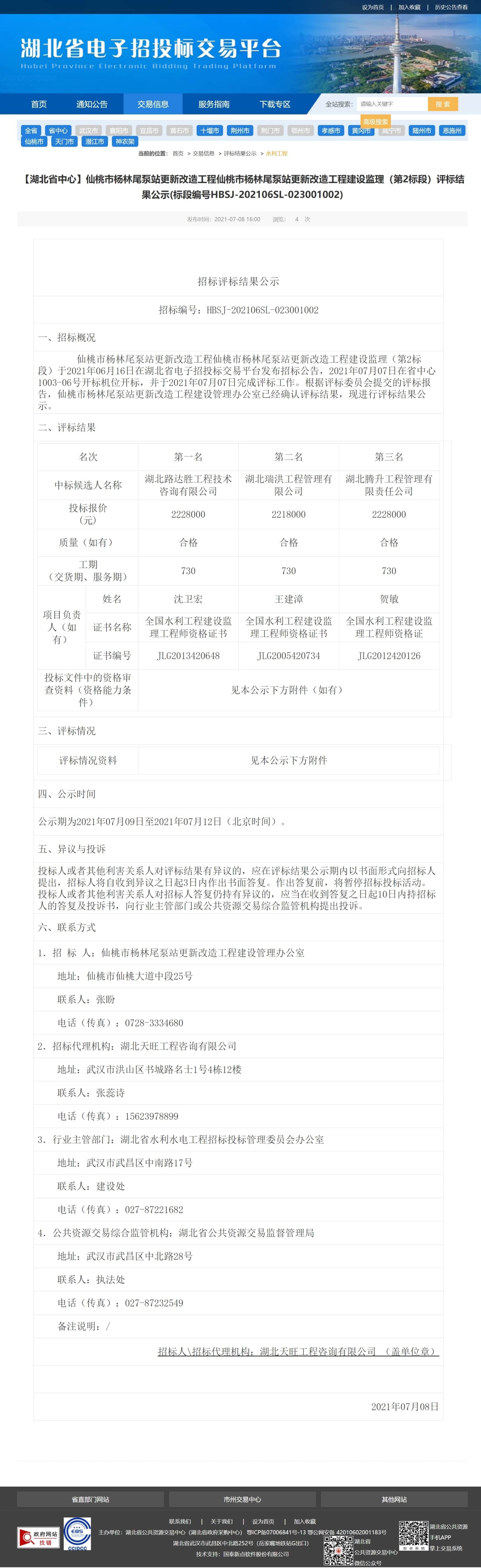 仙桃市杨林尾泵站更新改造工程仙桃市杨林尾泵站更新改造工程建设监理(第2标段)于2021年06月16日在湖北省电子招投标交易平台发布招标公告,2021年07月07日在省中心1003-06号开标机位开标,并于2021年07月07日完成评标工作。根据评标委员会提交的评标报告,仙桃市杨林尾泵站更新改造工程建设管理办公室已经确认评标结果,现进行评标结果公示。