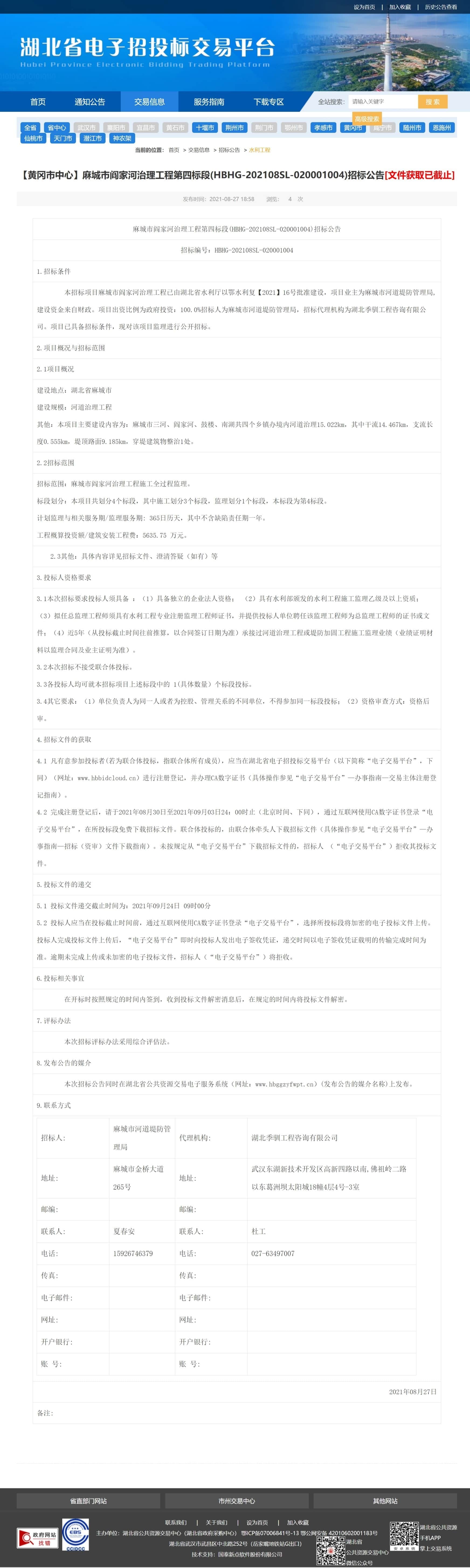1.招标条件 本招标项目麻城市阎家河治理工程已由湖北省水利厅以鄂水利复【2021】16号批准建设,项目业主为麻城市河道堤防管理局,建设资金来自财政。项目出资比例为政府投资:100.0%招标人为麻城市河道堤防管理局,招标代理机构为湖北季驯工程咨询有限公司。项目已具备招标条件,现对该项目监理进行公开招标。