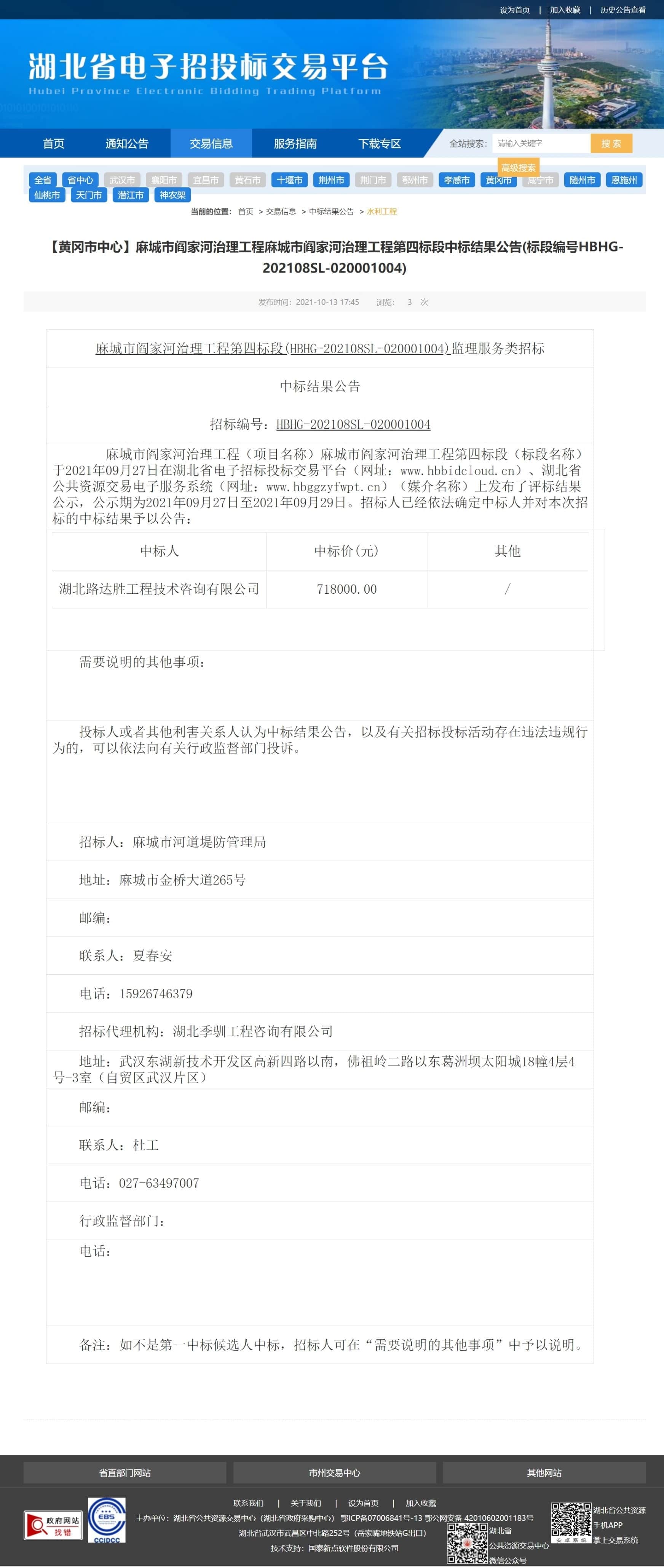 麻城市阎家河治理工程(项目名称)麻城市阎家河治理工程第四标段(标段名称)于2021年09月27日在湖北省电子招标投标交易平台(网址:www.hbbidcloud.cn)、湖北省公共资源交易电子服务系统(网址:www.hbggzyfwpt.cn)(媒介名称)上发布了评标结果公示,公示期为2021年09月27日至2021年09月29日。招标人已经依法确定中标人并对本次招标的中标结果予以公告: