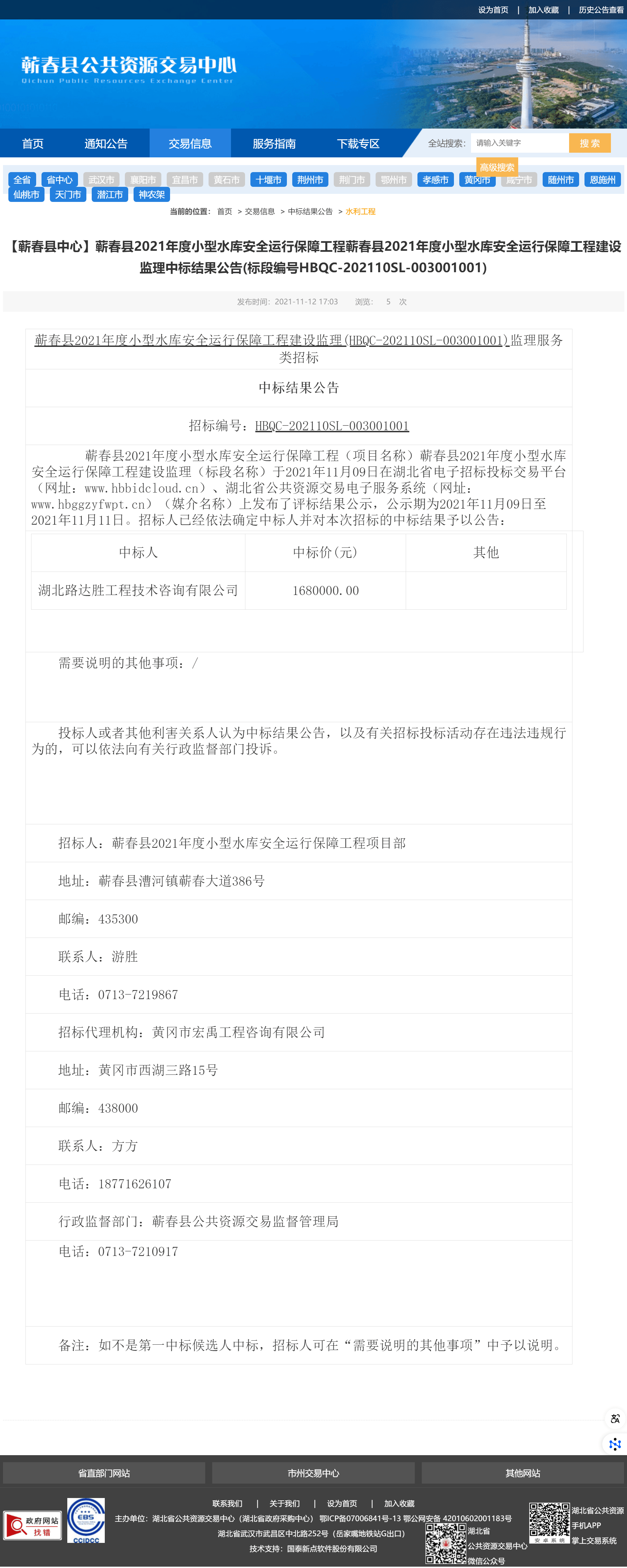 蕲春县2021年度小型水库安全运行保障工程(项目名称)蕲春县2021年度小型水库安全运行保障工程建设监理(标段名称)于2021年11月09日在湖北省电子招标投标交易平台(网址:www.hbbidcloud.cn)、湖北省公共资源交易电子服务系统(网址:www.hbggzyfwpt.cn)(媒介名称)上发布了评标结果公示,公示期为2021年11月09日至2021年11月11日。招标人已经依法确定中标人并对本次招标的中标结果予以公告: