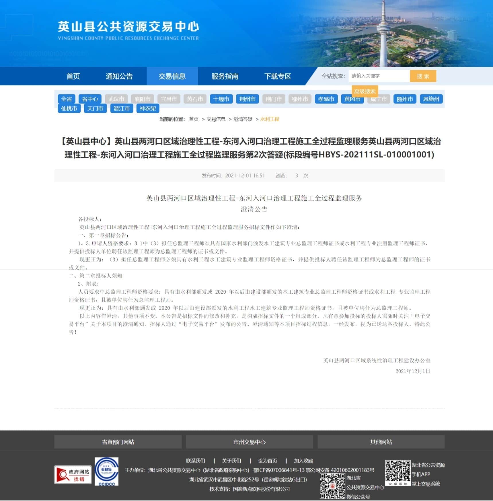 【英山县中心】英山县两河口区域治理性工程-东河入河口治理工程施工全过程监理服务英山县两河口区域治理性工程-东河入河口治理工程施工全过程监理服务第2次答疑(标段编号HBYS-202111SL-010001001)