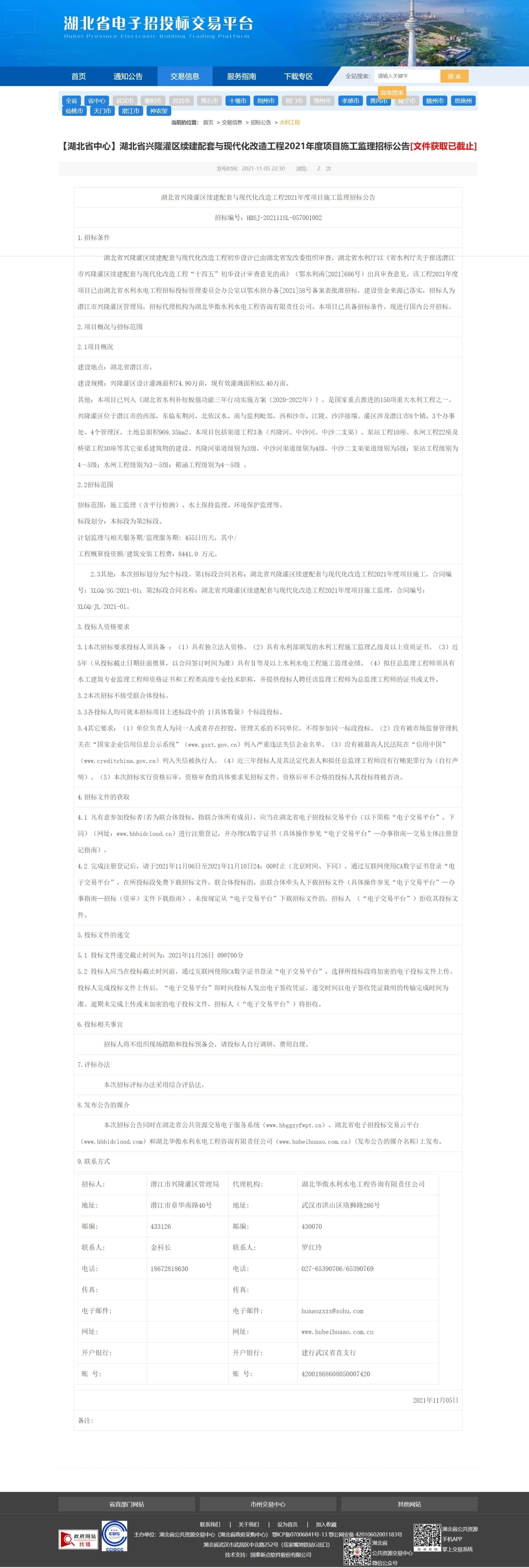 【湖北省中心】湖北省兴隆灌区续建配套与现代化改造工程2021年度项目施工监理招标公告