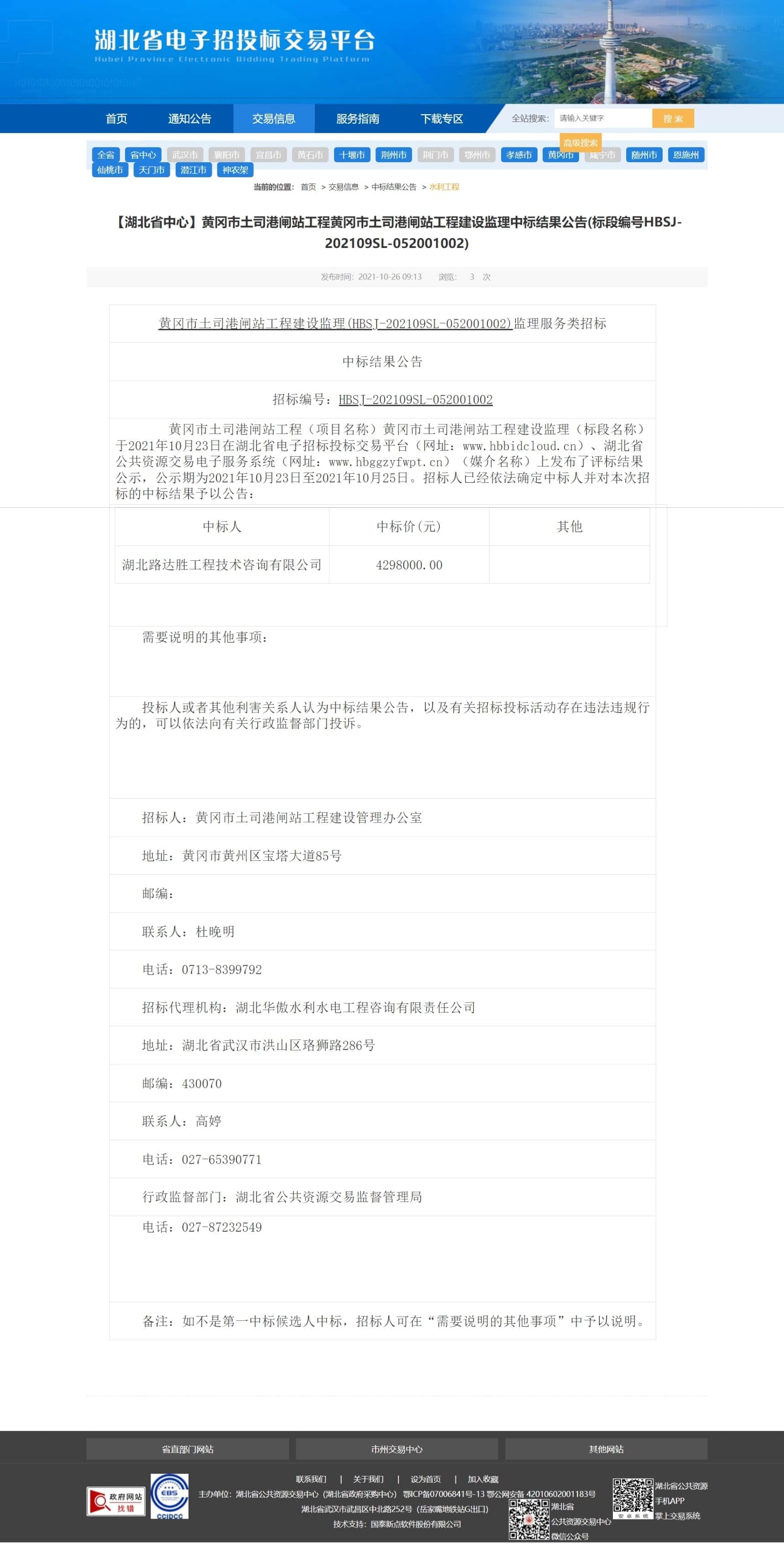 【湖北省中心】黄冈市土司港闸站工程黄冈市土司港闸站工程建设监理中标结果公告(标段编号HBSJ-202109SL-052001002)