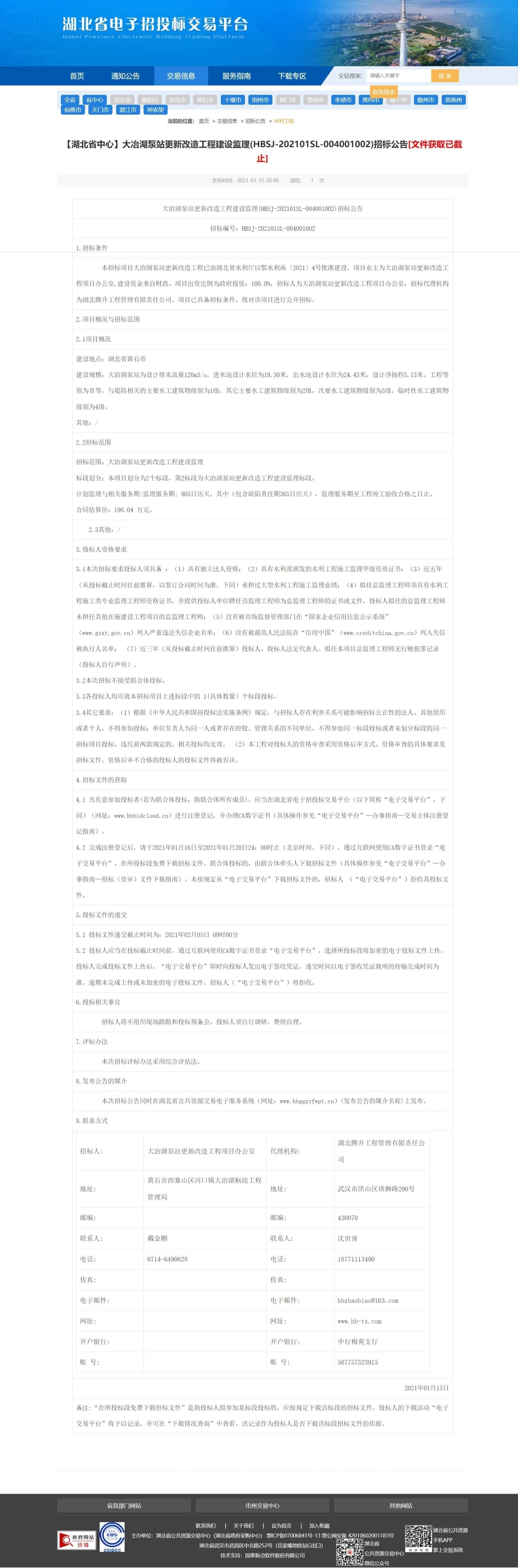 【湖北省中心】大冶湖泵站更新改造工程建设监理(HBSJ-202101SL-004001002)招标公告[文件获取已截止]