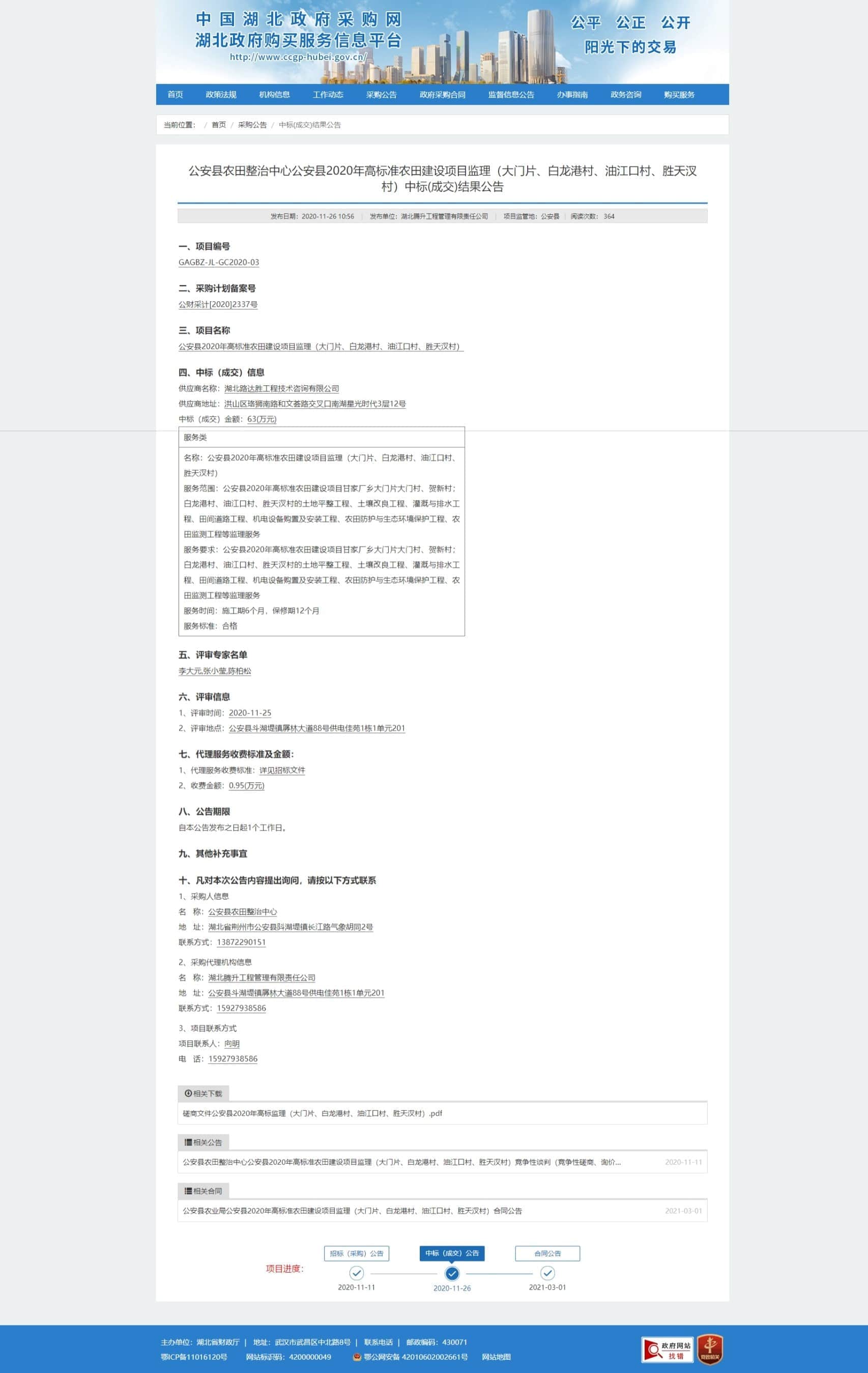 公安县农田整治中心公安县2020年高标准农田建设项目监理(大门片、白龙港村、油江口村、胜天汊村)中标(成交)结果公告
