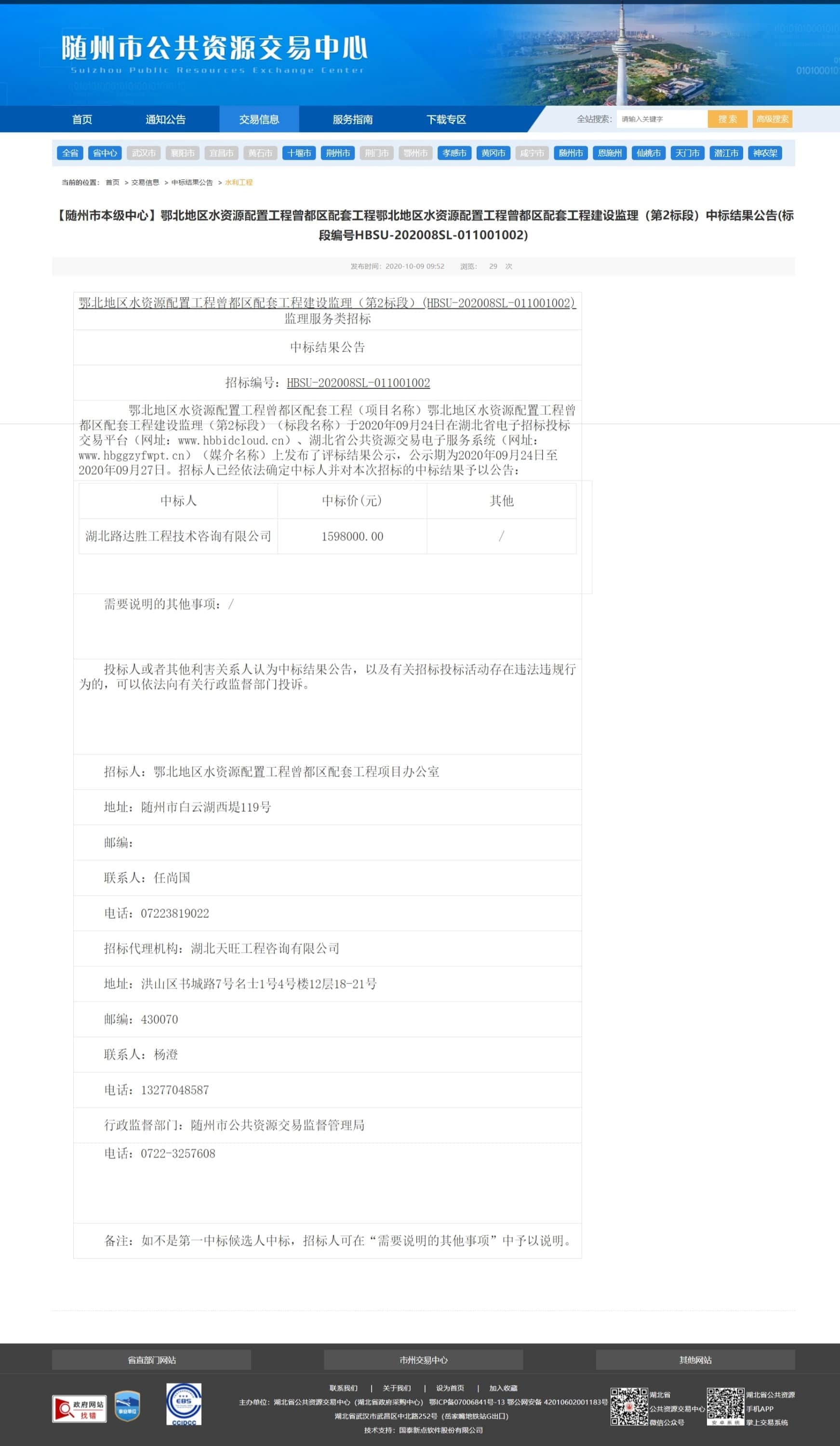 随州市本级中心】鄂北地区水资源配置工程曾都区配套工程鄂北地区水资源配置工程曾都区配套工程建设监理(第2标段)中标结果公告(标段编号HBSU-202008SL-011001002)