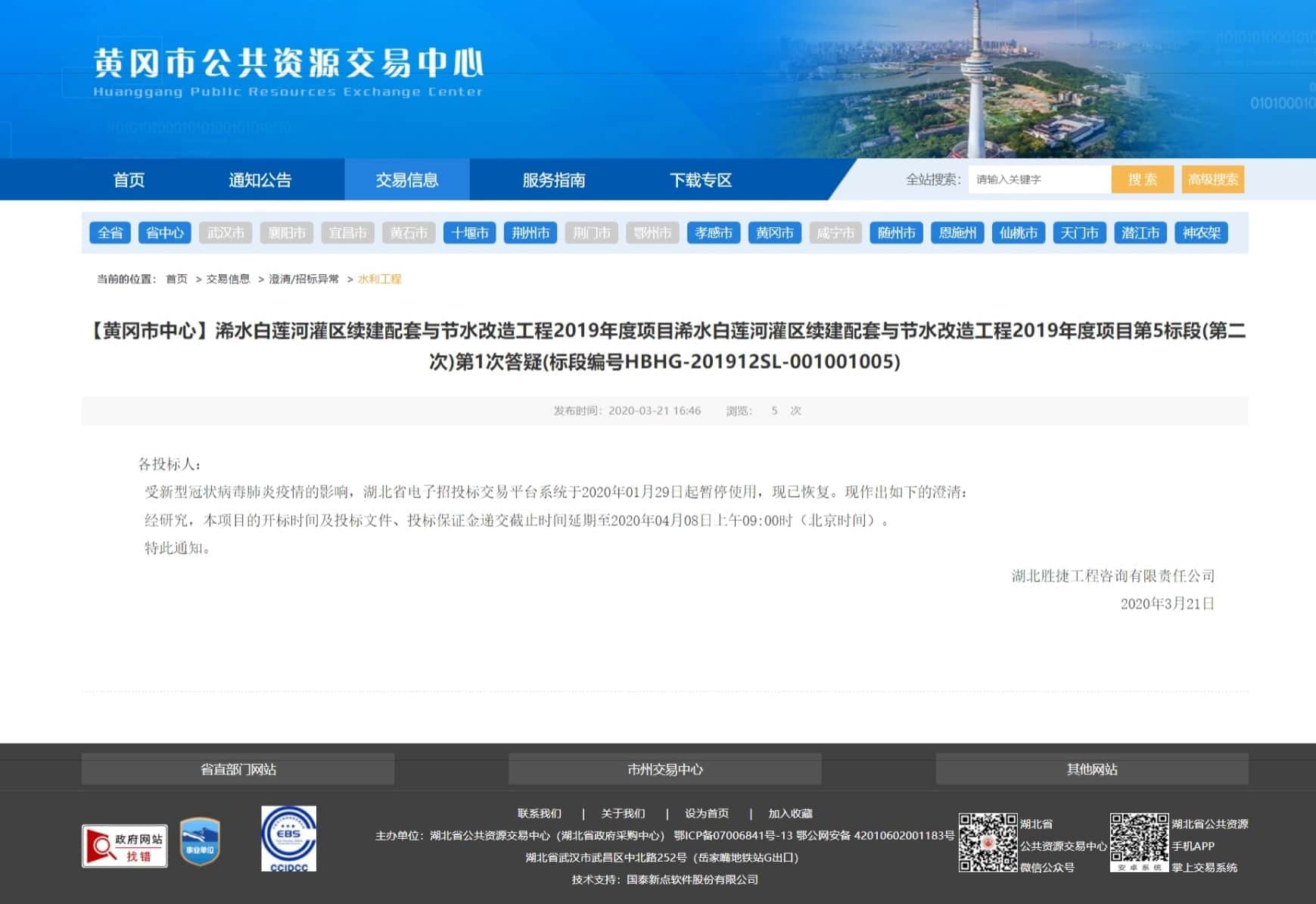 【黄冈市中心】浠水白莲河灌区续建配套与节水改造工程2019年度项目浠水白莲河灌区续建配套与节水改造工程2019年度项目第5标段(第二次)第1次答疑(标段编号HBHG-201912SL-001001005)