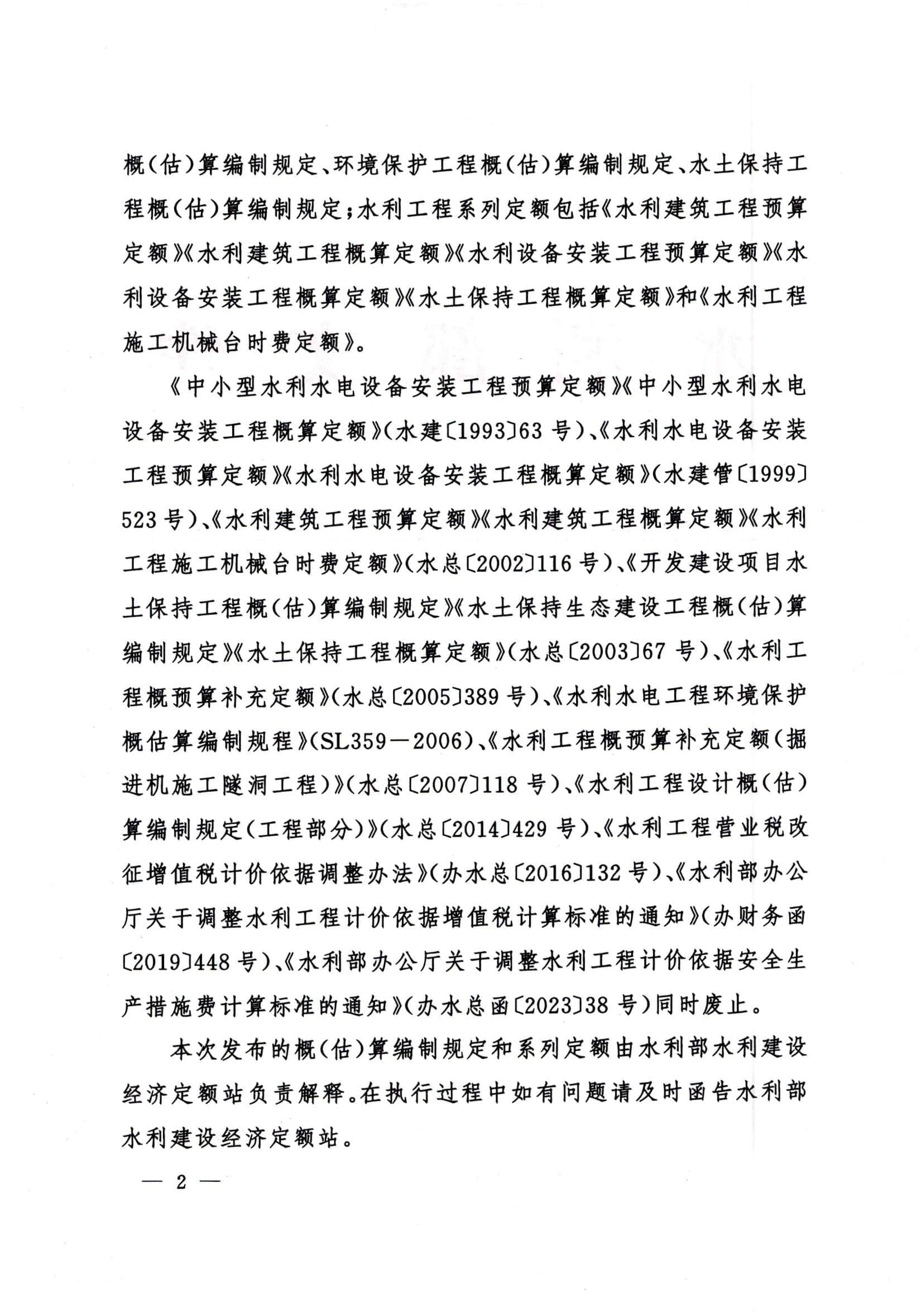 《中小型水利水电设备安装工程预算定额》《中小型水利水电设备安装工程概算定额》(水建〔1993〕63号)、《水利水电设备安装工程预算定额》《水利水电设备安装工程概算定额》(水建管〔1999〕523号)、《水利建筑工程预算定额》《水利建筑工程概算定额》《水利工程施工机械台时费定额》(水总〔2002〕116号)、《开发建设项目水土保持工程概(估)算编制规定》《水土保持生态建设工程概(估)算编制规定》《水土保持工程概算定额》(水总〔2003〕67号)、《水利工程概预算补充定额》(水总〔2005〕389号)、《水利水电工程环境保护概估算编制规程》(SL359-2006)、《水利工程概预算补充定额(掘进机施工隧洞工程)》(水总〔2007〕118号)、《水利工程设计概(估)算编制规定(工程部分)》(水总〔2014〕429 号)、《水利工程营业税改征增值税计价依据调整办法》(办水总〔2016〕132号)、《水利部办公厅关于调整水利工程计价依据增值税计算标准的通知》(办财务函〔2019〕448号)、《水利部办公厅关于调整水利工程计价依据安全生产措施费计算标准的通知》(办水总函〔2023〕38号)同时废止。