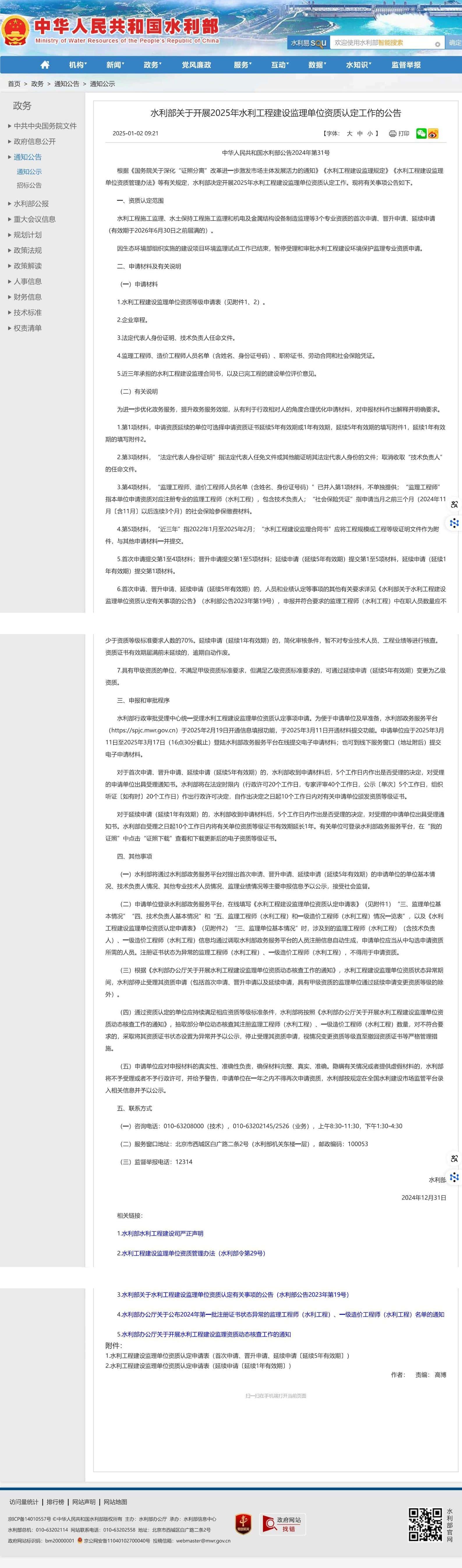 水利部关于开展2025年水利工程建设监理单位资质认定工作的公告