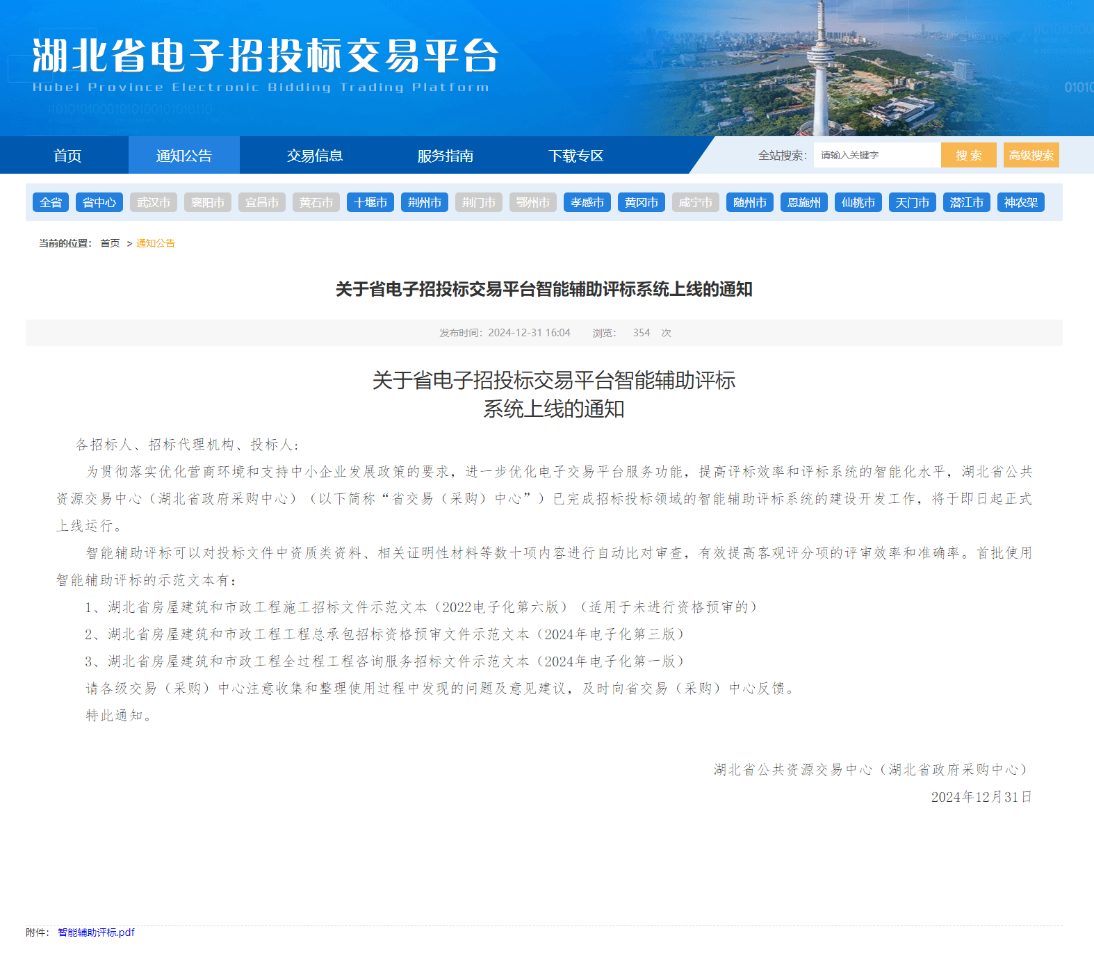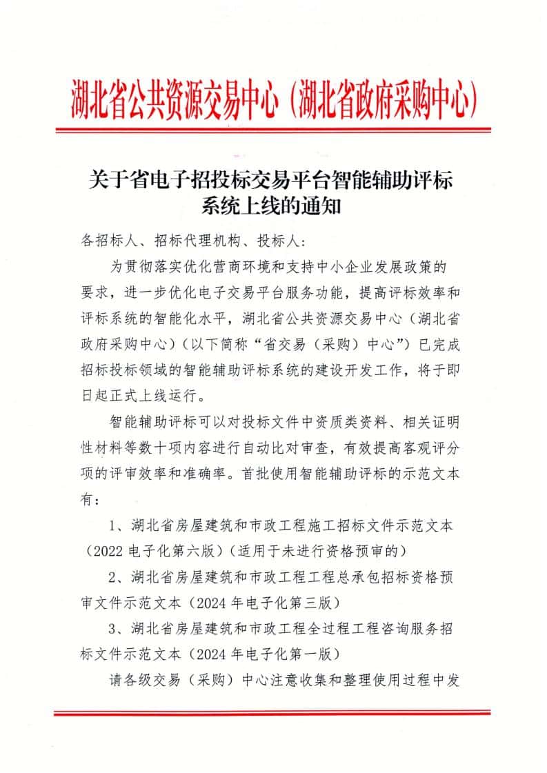 为贯彻落实优化营商环境和支持中小企业发展政策的要求,进一步优化电子交易平台服务功能,提高评标效率和评标系统的智能化水平,湖北省公共资源交易中心(湖北省政府采购中心)(以下简称“省交易(采购)中心”)已完成招标投标领域的智能辅助评标系统的建设开发工作,将于即日起正式上线运行。