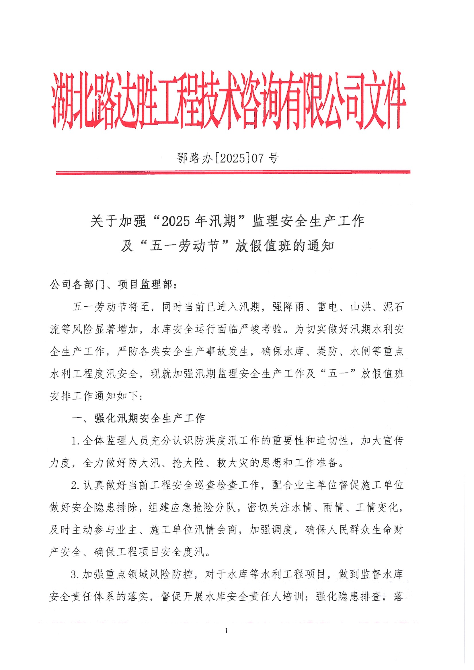 关于加强“2025年汛期”监理安全生产工作及“五一劳动节”放假值班的通知