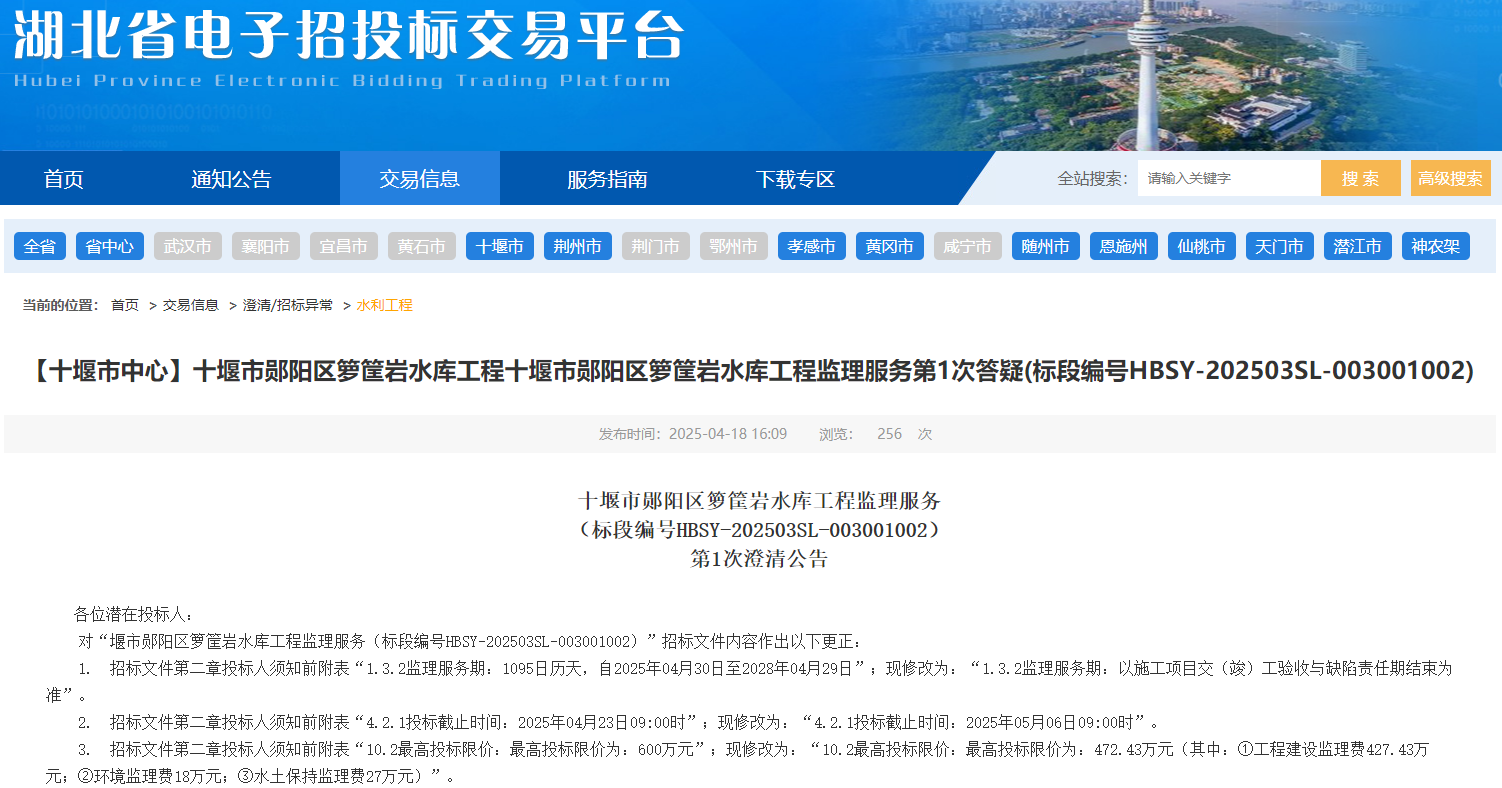 对“堰市郧阳区箩筐岩水库工程监理服务(标段编号HBSY-202503SL-003001002)”招标文件内容作出以下更正: