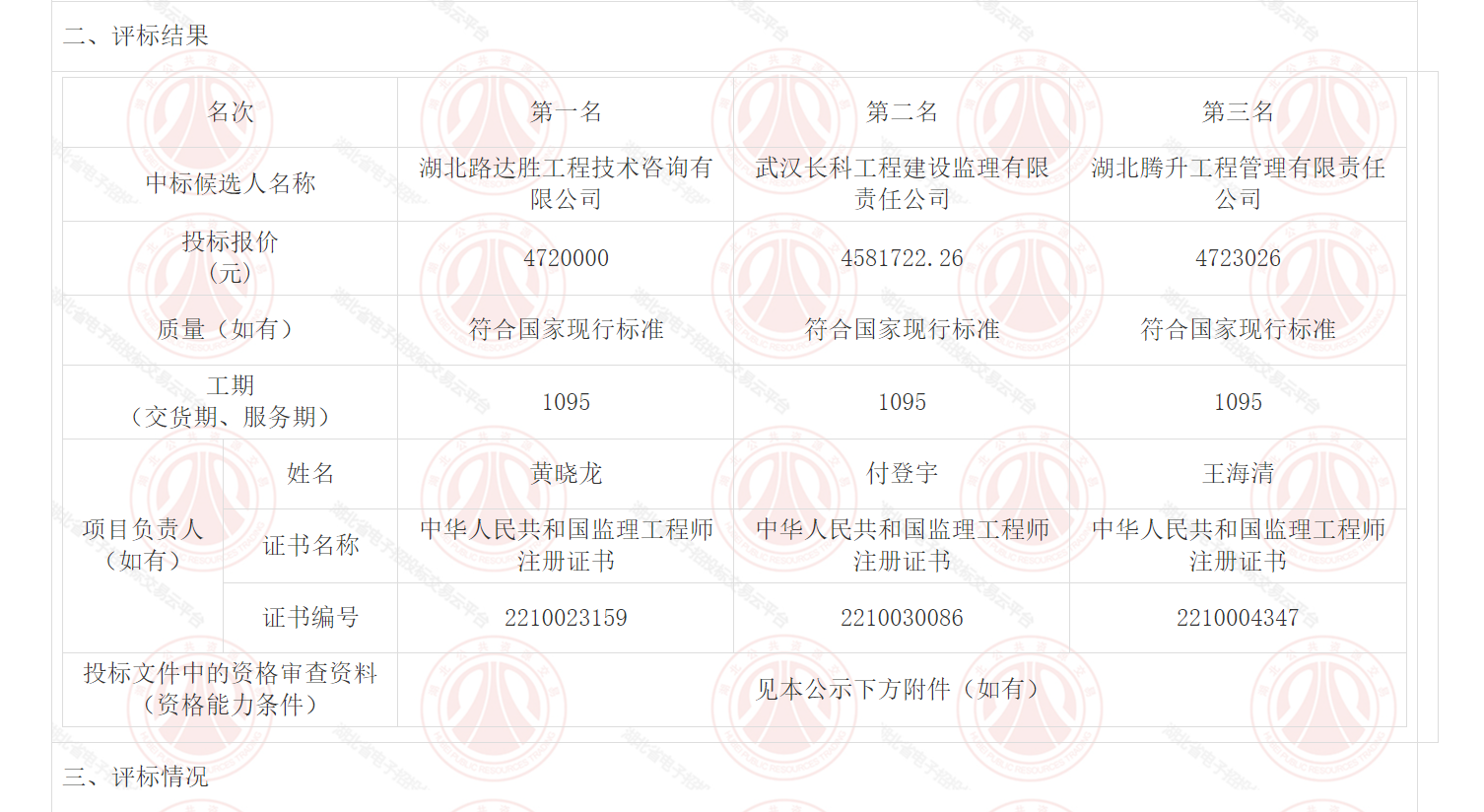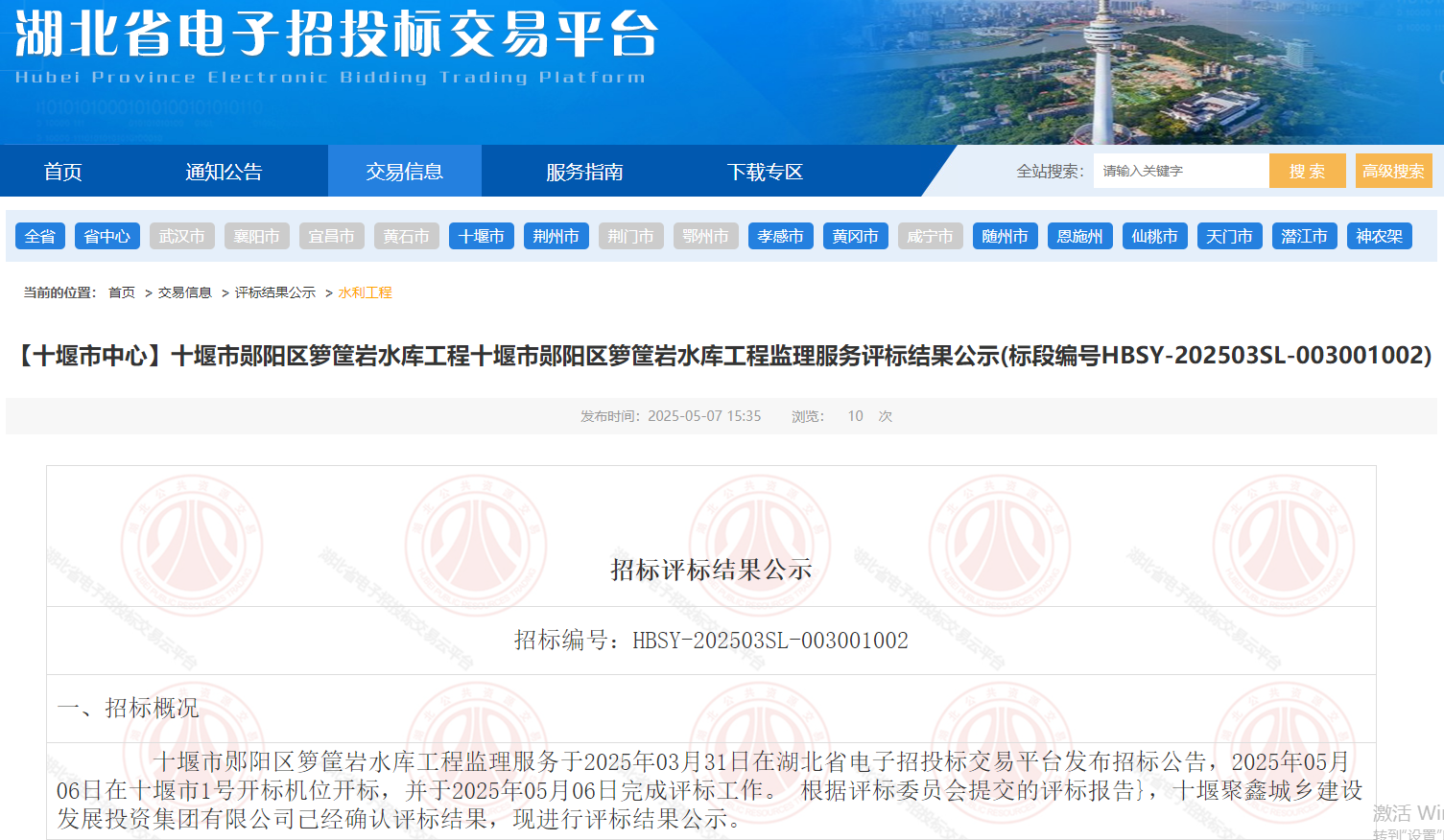 十堰市郧阳区箩筐岩水库工程监理服务于2025年03月31日在湖北省电子招投标交易平台发布招标公告,2025年05月06日在十堰市1号开标机位开标,并于2025年05月06日完成评标工作。 根据评标委员会提交的评标报告},十堰聚鑫城乡建设发展投资集团有限公司已经确认评标结果,现进行评标结果公示。