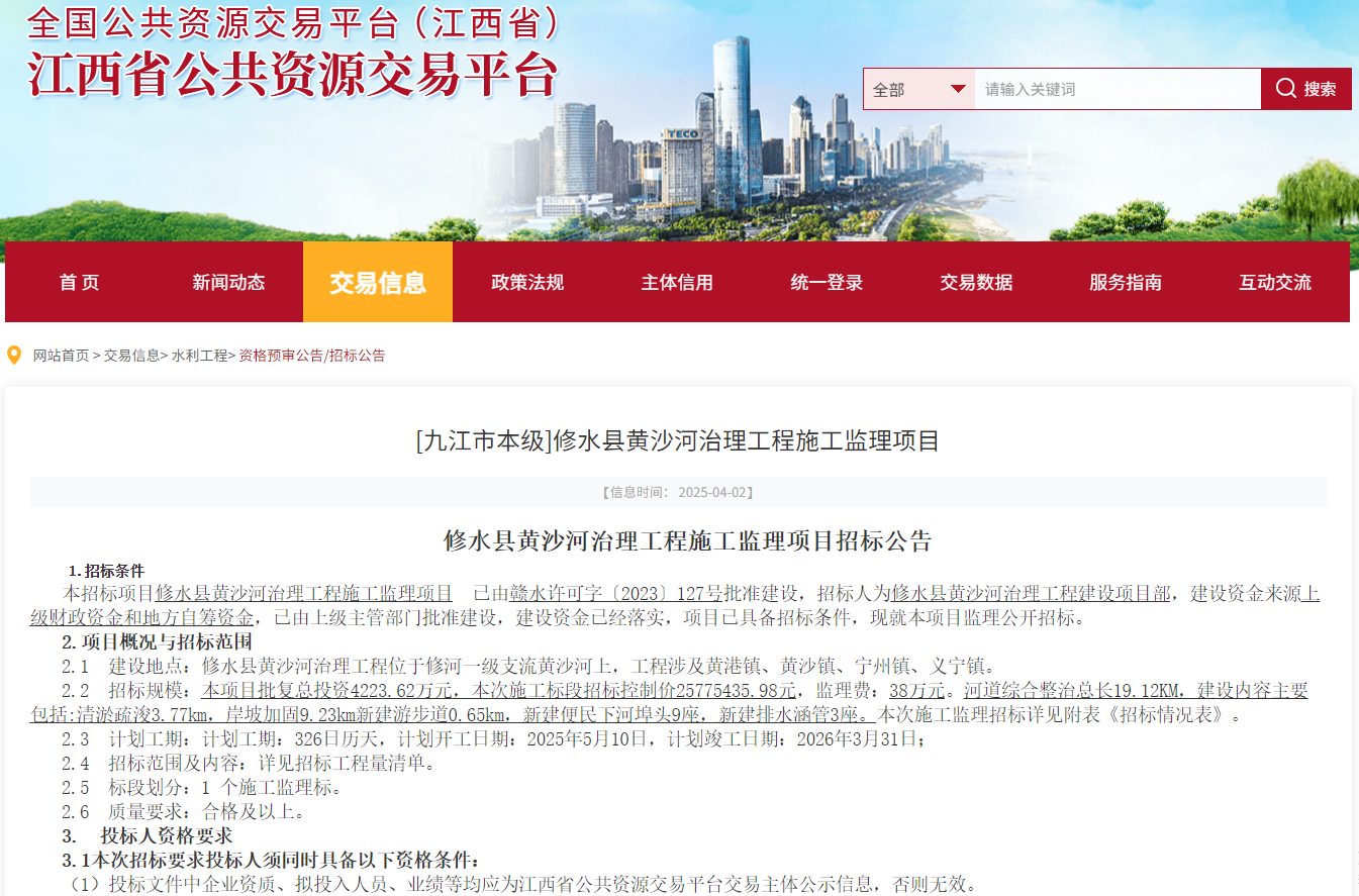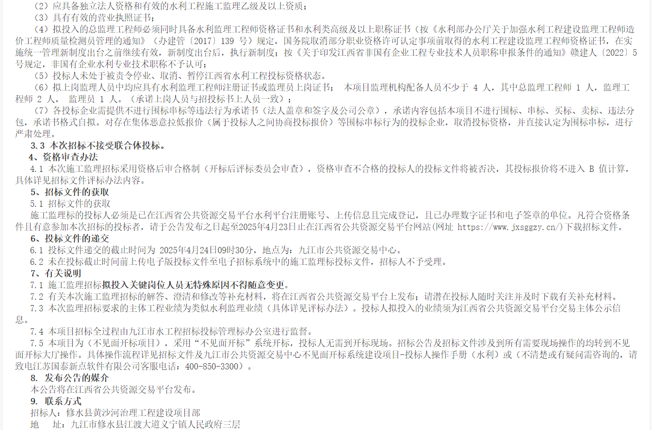 施工监理标的投标人必须是已在江西省公共资源交易平台水利平台注册账号、上传信息且完成登记,且已办理数字证书和电子签章的单位。凡符合资格条件且有意参加本次招标的投标者,请于公告发布之日起至2025年4月23日止在江西省公共资源交易平台网站(网址 https://www.jxsggzy.cn/)下载招标文件。