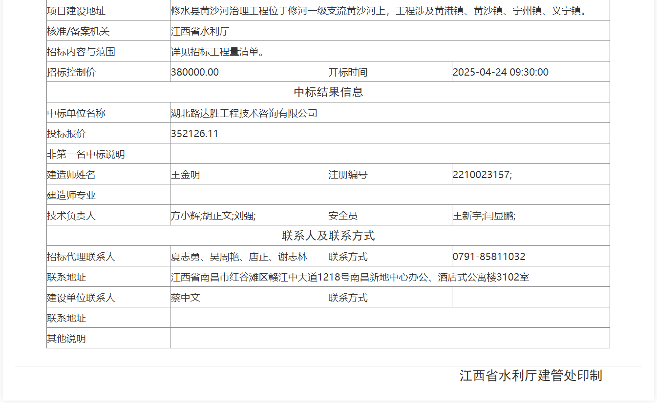 修水县黄沙河治理工程施工监理项目中标结果公示