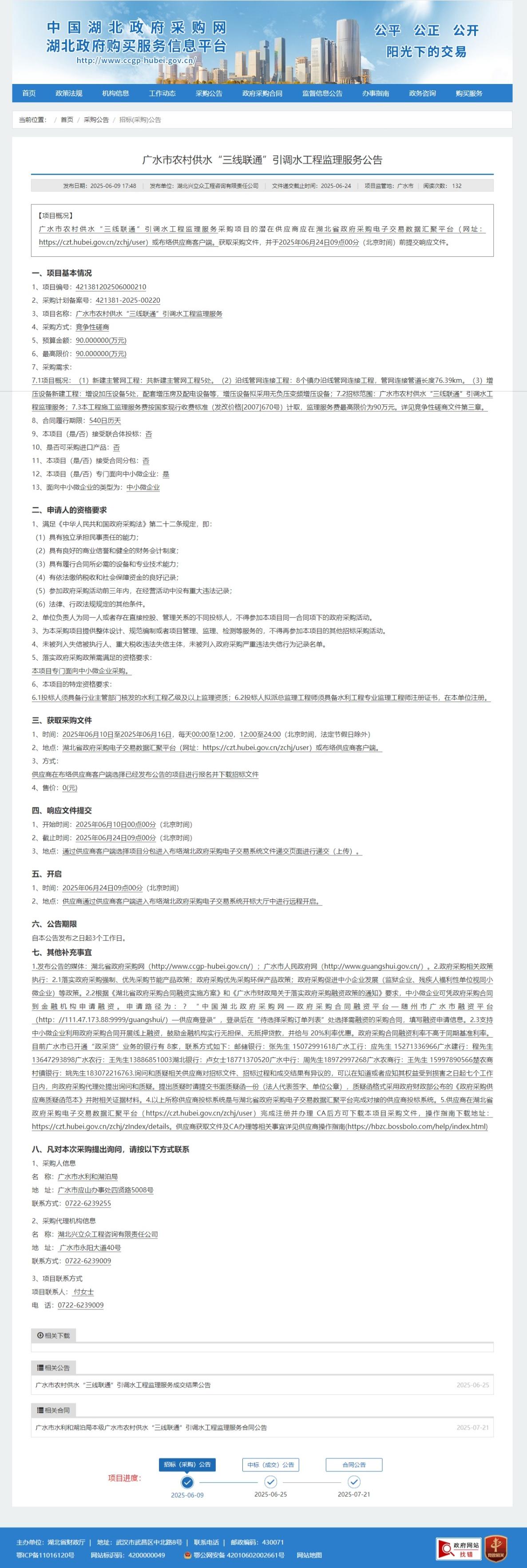 广水市农村供水“三线联通”引调水工程监理服务采购项目的潜在供应商应在湖北省政府采购电子交易数据汇聚平台(网址:https://czt.hubei.gov.cn/zchj/user)或布络供应商客户端。获取采购文件,并于2025年06月24日09点00分(北京时间)前提交响应文件。