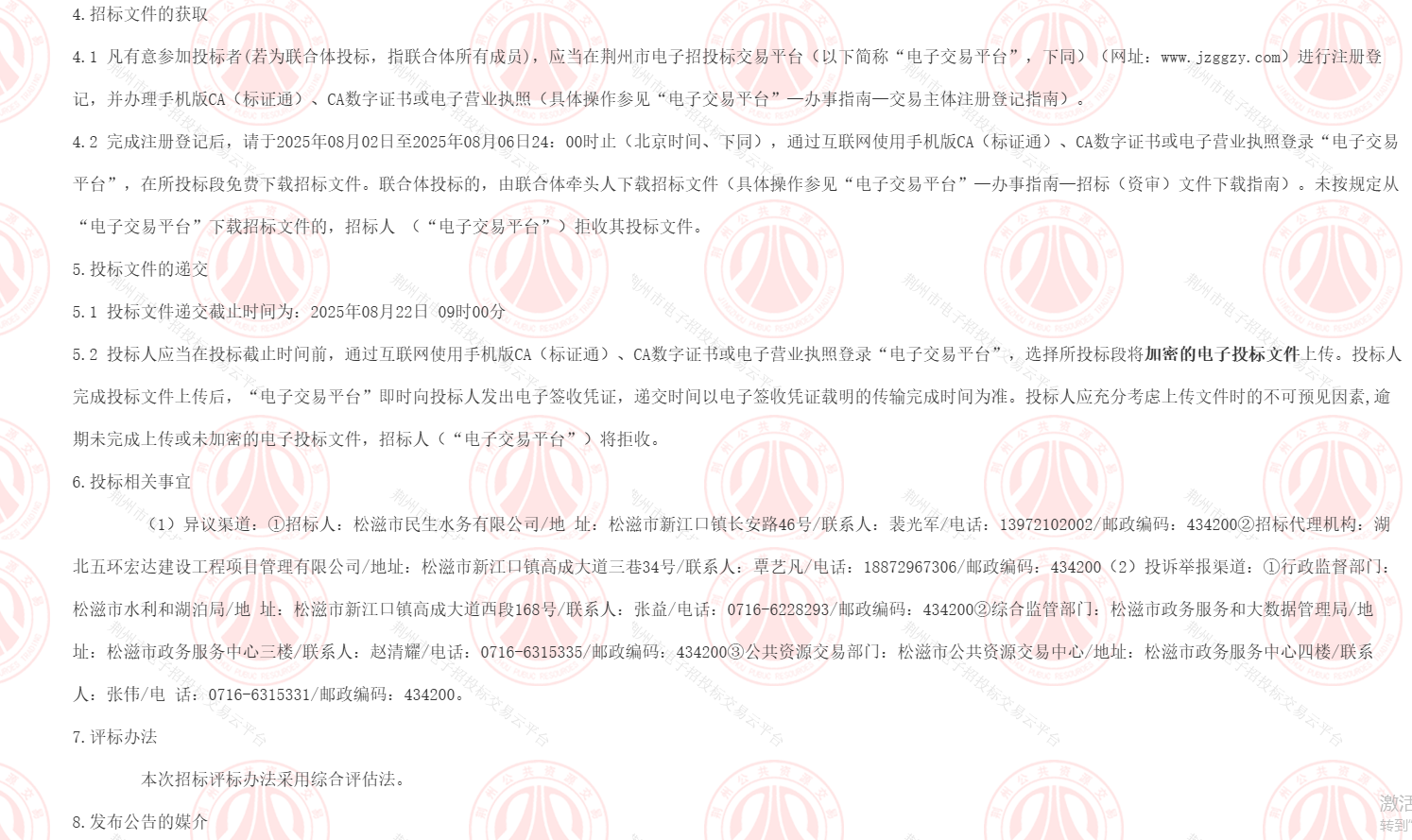 本次招标行政监督部门为 松滋市水利和湖泊局,电话 0716-6228293