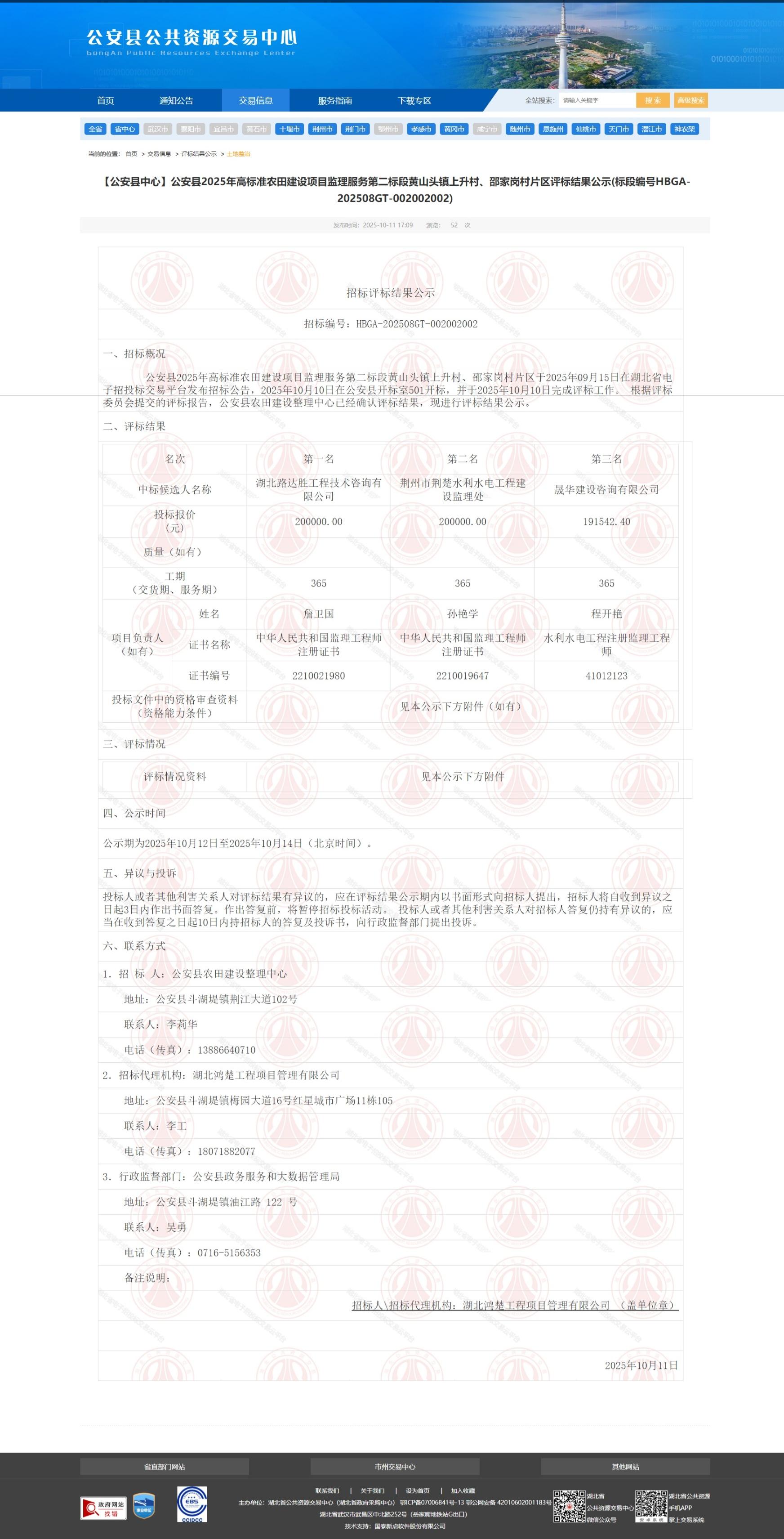 公安县2025年高标准农田建设项目监理服务第二标段黄山头镇上升村、邵家岗村片区于2025年09月15日在湖北省电子招投标交易平台发布招标公告,2025年10月10日在公安县开标室501开标,并于2025年10月10日完成评标工作。 根据评标委员会提交的评标报告,公安县农田建设整理中心已经确认评标结果,现进行评标结果公示。
