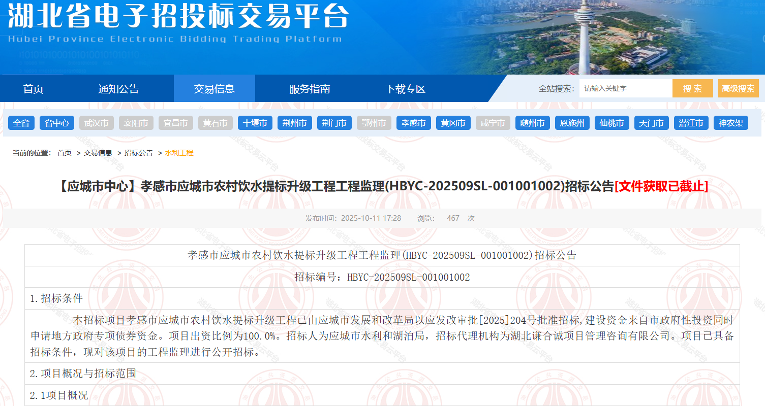 孝感市应城市农村饮水提标升级工程工程监理(HBYC-202509SL-001001002)招标公告