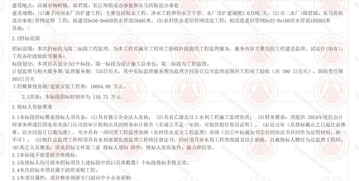 | 本招标项目孝感市应城市农村饮水提标升级工程已由应城市发展和改革局以应发改审批[2025]204号批准招标,建设资金来自市政府性投资同时申请地方政府专项债券资金。项目出资比例为100.0%。招标人为应城市水利和湖泊局,招标代理机构为湖北谦合诚项目管理咨询有限公司。项目已具备招标条件,现对该项目的工程监理进行公开招标。 | ||||||||||||||||||||||||||||||||||||||||