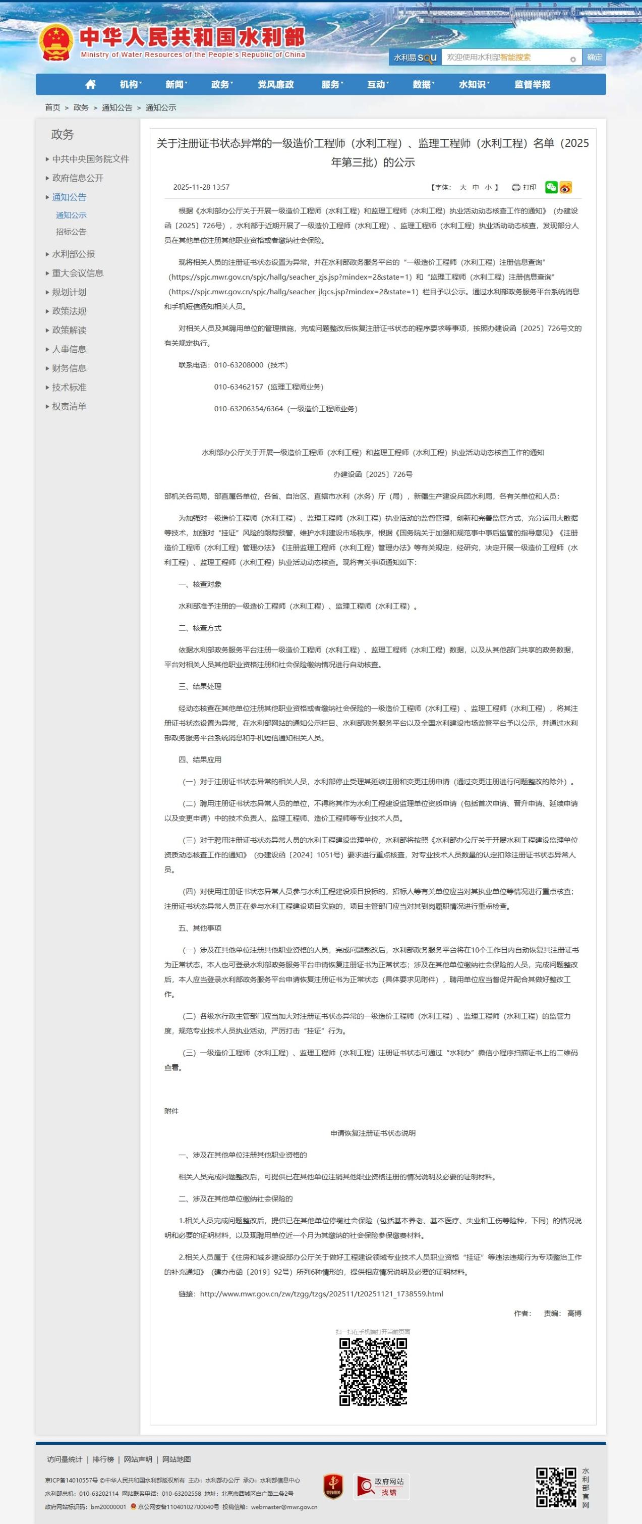 现将相关人员的注册证书状态设置为异常,并在水利部政务服务平台的“一级造价工程师(水利工程)注册信息查询”(https://spjc.mwr.gov.cn/spjc/hallg/seacher_zjs.jsp?mindex=2&state=1)和“监理工程师(水利工程)注册信息查询”(https://spjc.mwr.gov.cn/spjc/hallg/seacher_jlgcs.jsp?mindex=2&state=1)栏目予以公示。通过水利部政务服务平台系统消息和手机短信通知相关人员。