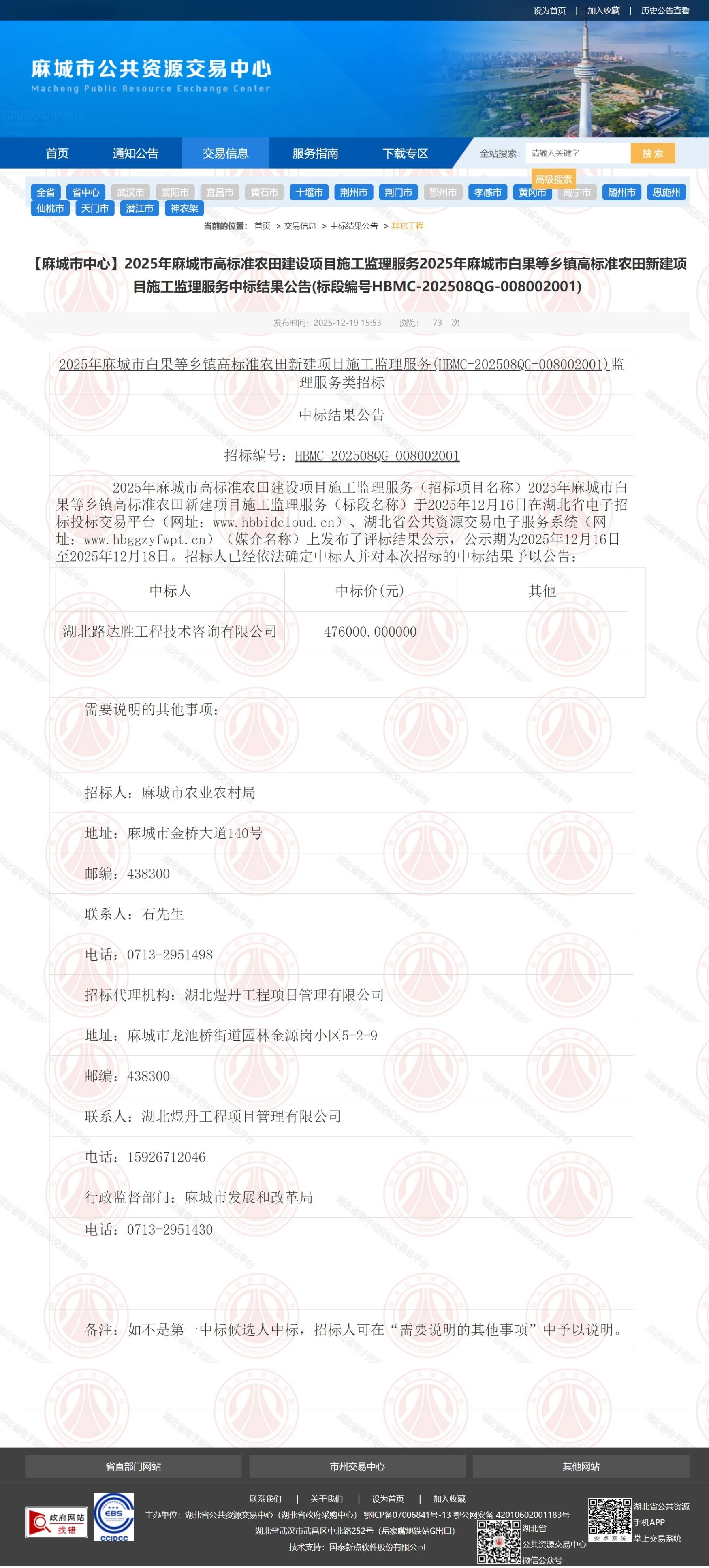 2025年麻城市高标准农田建设项目施工监理服务(招标项目名称)2025年麻城市白果等乡镇高标准农田新建项目施工监理服务(标段名称)于2025年12月16日在湖北省电子招标投标交易平台(网址:www.hbbidcloud.cn)、湖北省公共资源交易电子服务系统(网址:www.hbggzyfwpt.cn)(媒介名称)上发布了评标结果公示,公示期为2025年12月16日至2025年12月18日。招标人已经依法确定中标人并对本次招标的中标结果予以公告: