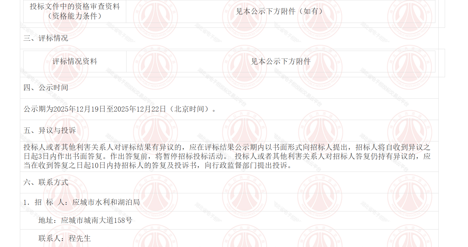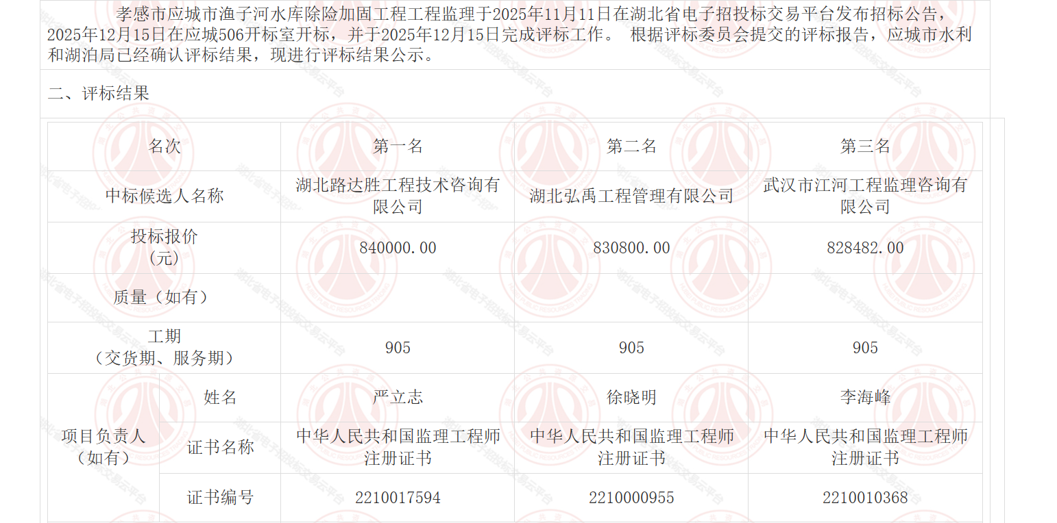 孝感市应城市渔子河水库除险加固工程工程监理于2025年11月11日在湖北省电子招投标交易平台发布招标公告,2025年12月15日在应城506开标室开标,并于2025年12月15日完成评标工作。 根据评标委员会提交的评标报告,应城市水利和湖泊局已经确认评标结果,现进行评标结果公示。
