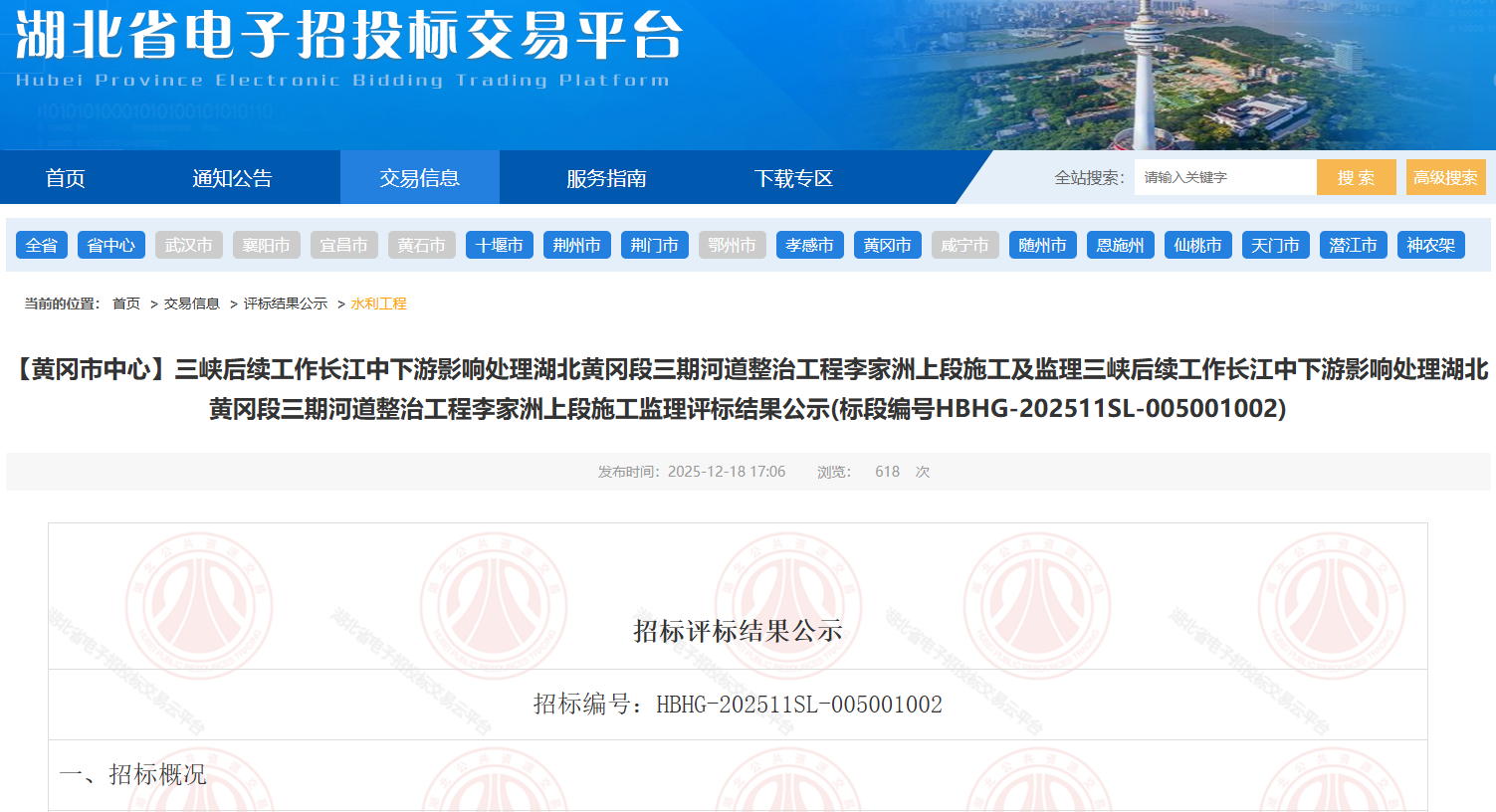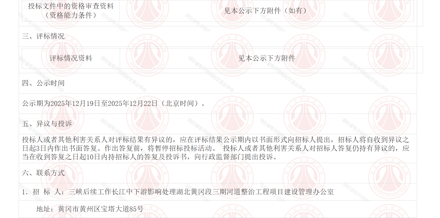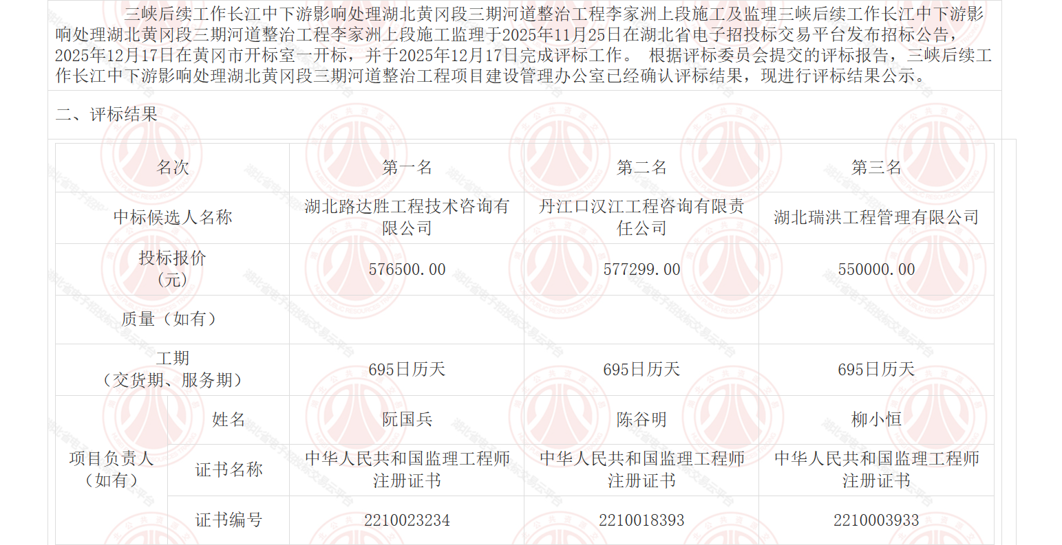 三峡后续工作长江中下游影响处理湖北黄冈段三期河道整治工程李家洲上段施工及监理三峡后续工作长江中下游影响处理湖北黄冈段三期河道整治工程李家洲上段施工监理于2025年11月25日在湖北省电子招投标交易平台发布招标公告,2025年12月17日在黄冈市开标室一开标,并于2025年12月17日完成评标工作。 根据评标委员会提交的评标报告,三峡后续工作长江中下游影响处理湖北黄冈段三期河道整治工程项目建设管理办公室已经确认评标结果,现进行评标结果公示。