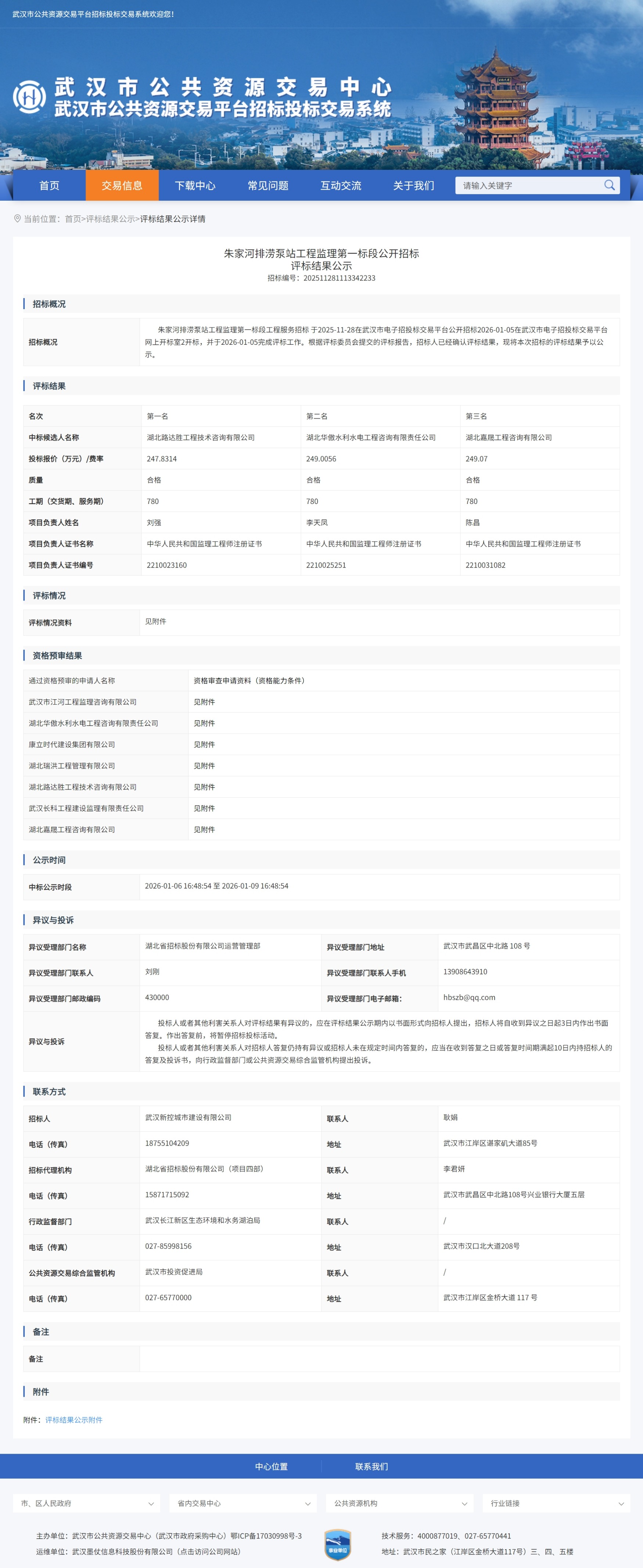 汉川市汈汊湖清淤及综合治理工程一期监理服务项目(第二次)评标结果公示