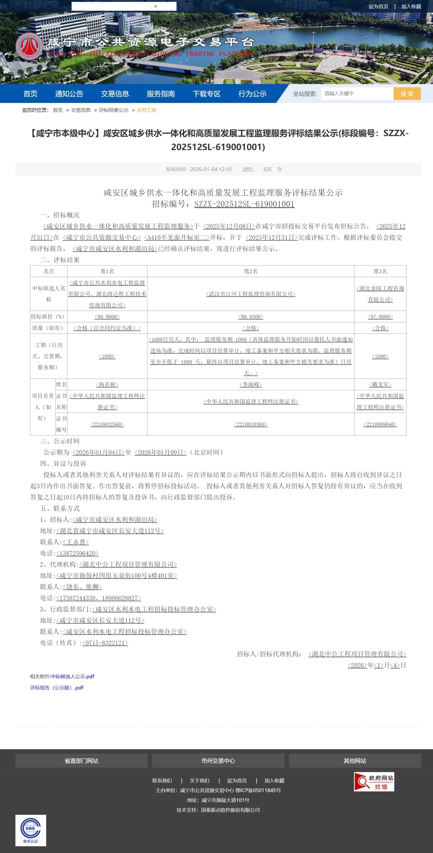 咸安区城乡供水一体化和高质量发展工程监理服务于 2025年12月08日在咸宁市招投标交易平台发布招标公告,2025年12月31日在 咸宁市公共资源交易中心A410不见面开标室二开标,并于 2025年12月31日完成评标工作。根据评标委员会提交的评标报告, 咸宁市咸安区水利和湖泊局已经确认评标结果,现进行评标结果公示。
