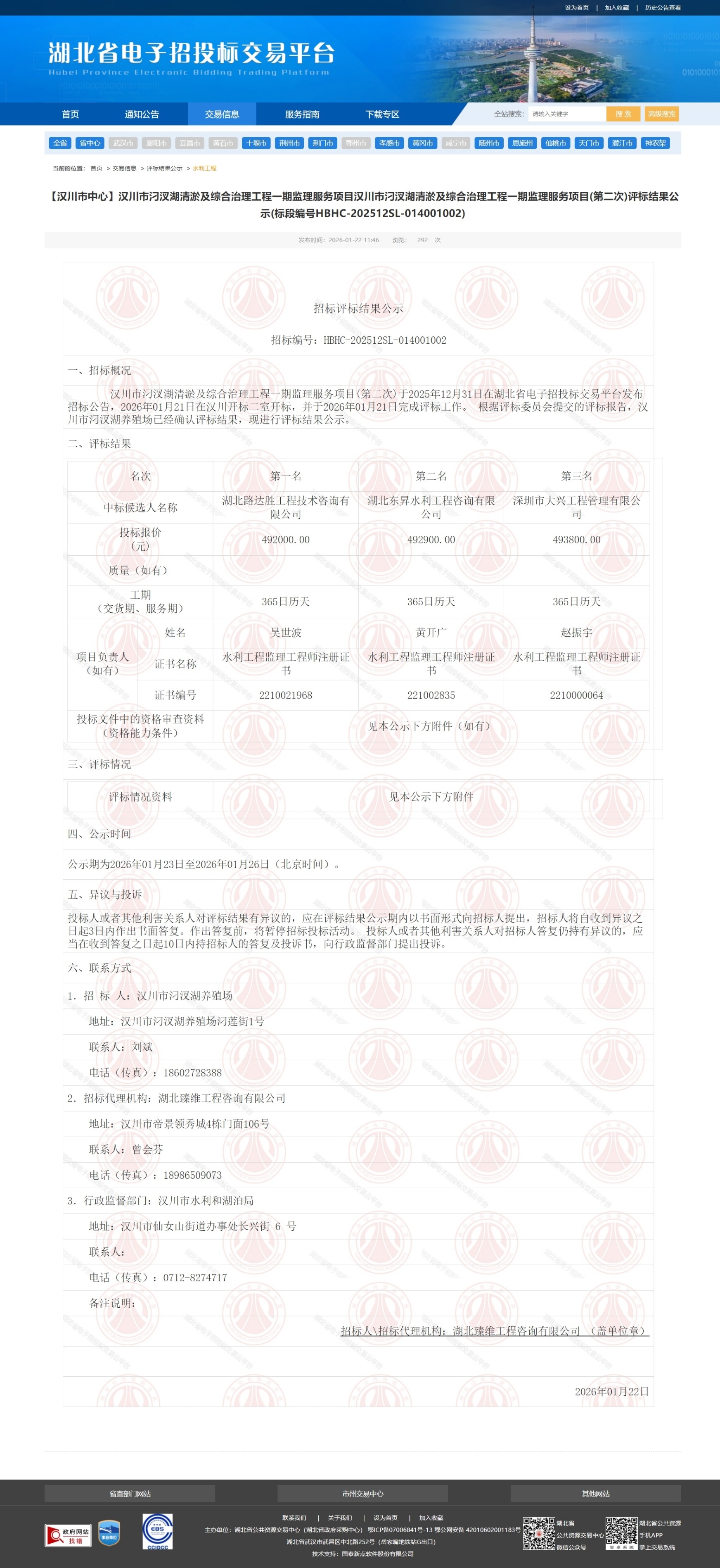 汉川市汈汊湖清淤及综合治理工程一期监理服务项目(第二次)于2025年12月31日在湖北省电子招投标交易平台发布招标公告,2026年01月21日在汉川开标二室开标,并于2026年01月21日完成评标工作。 根据评标委员会提交的评标报告,汉川市汈汊湖养殖场已经确认评标结果,现进行评标结果公示。