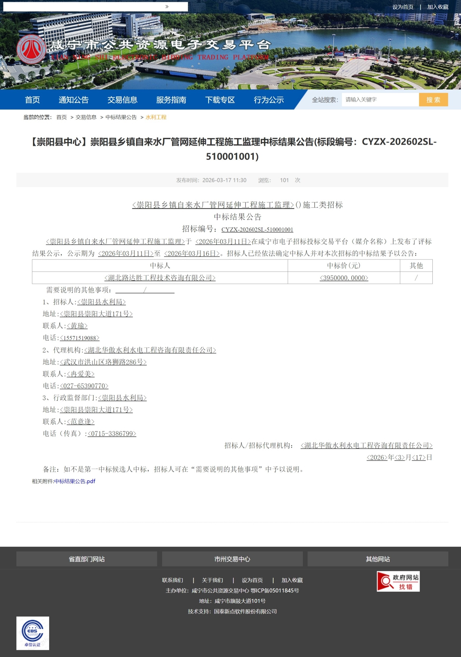 <崇阳县乡镇自来水厂管网延伸工程施工监理>于 <2026年03月11日>在咸宁市电子招标投标交易平台(媒介名称)上发布了评标结果公示,公示期为 <2026年03月11日>至 <2026年03月16日>。招标人已经依法确定中标人并对本次招标的中标结果予以公告: