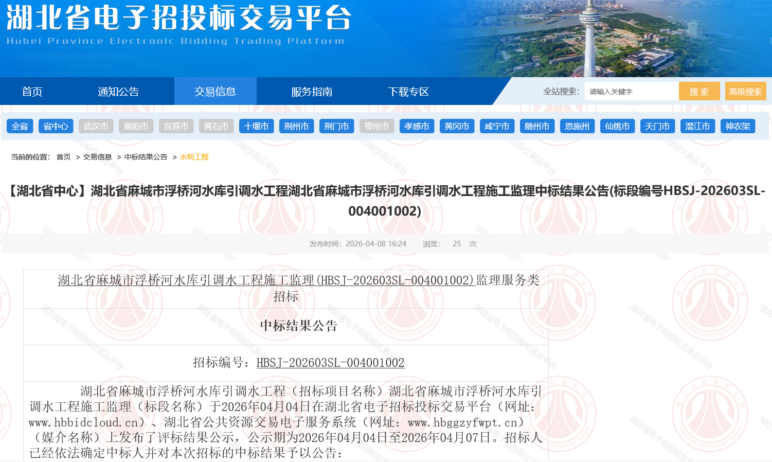 湖北省麻城市浮桥河水库引调水工程(招标项目名称)湖北省麻城市浮桥河水库引调水工程施工监理(标段名称)于2026年04月04日在湖北省电子招标投标交易平台(网址:www.hbbidcloud.cn)、湖北省公共资源交易电子服务系统(网址:www.hbggzyfwpt.cn)(媒介名称)上发布了评标结果公示,公示期为2026年04月04日至2026年04月07日。招标人已经依法确定中标人并对本次招标的中标结果予以公告: