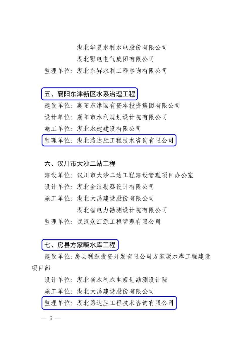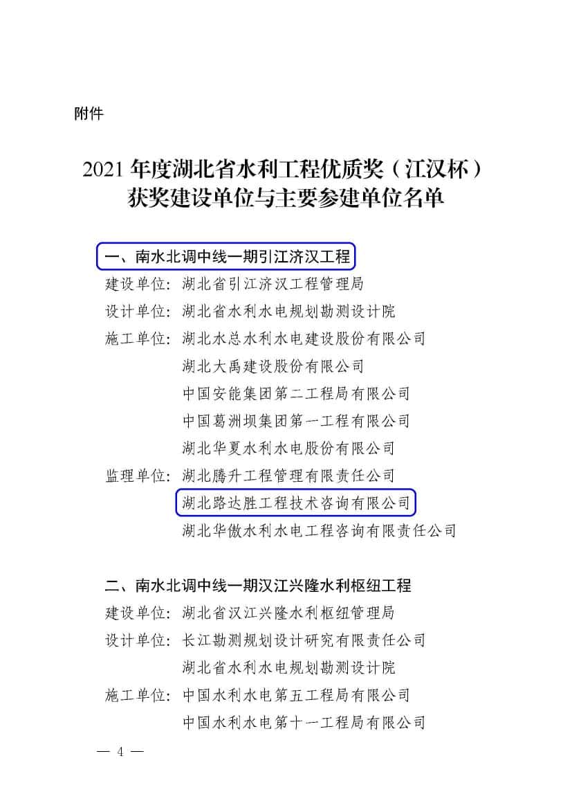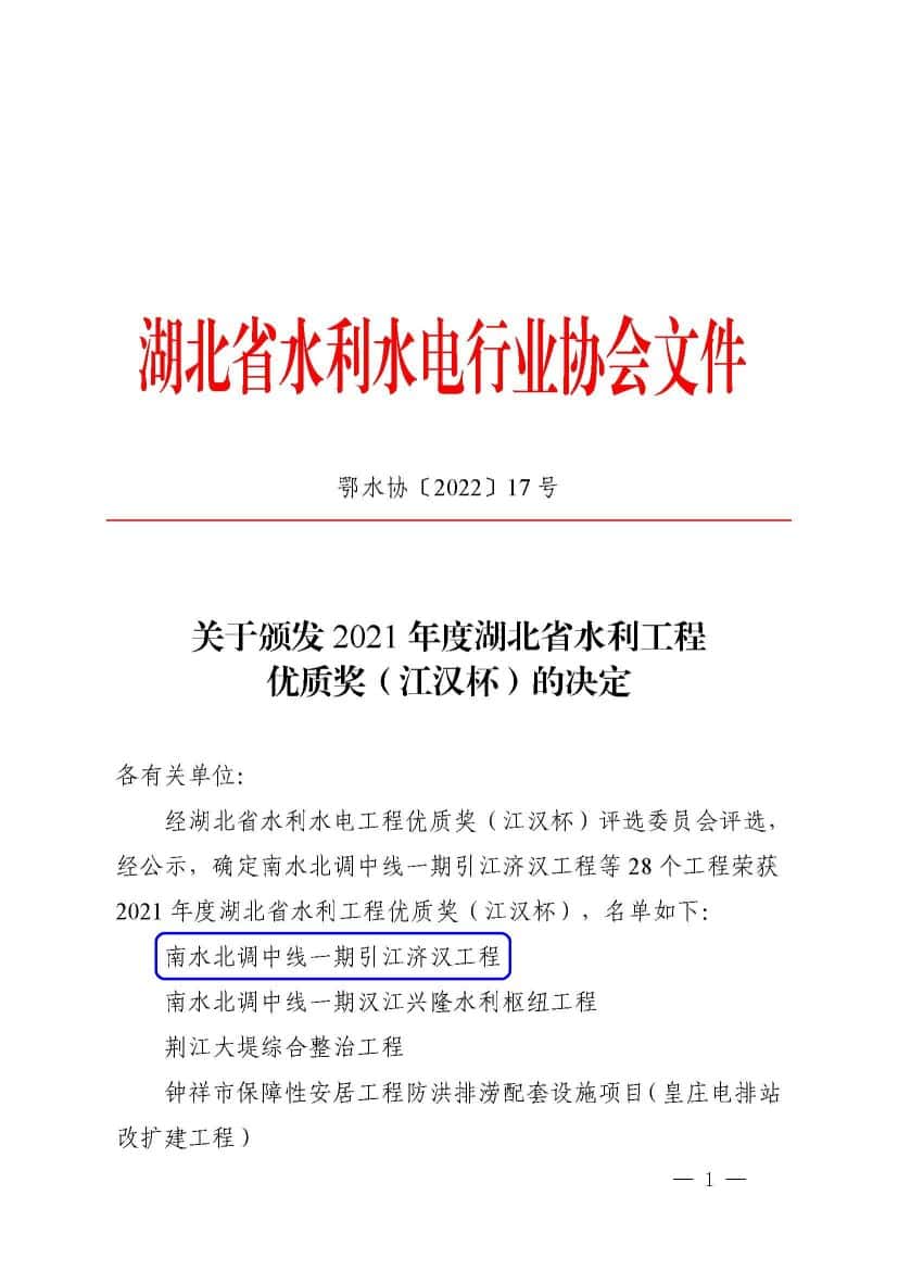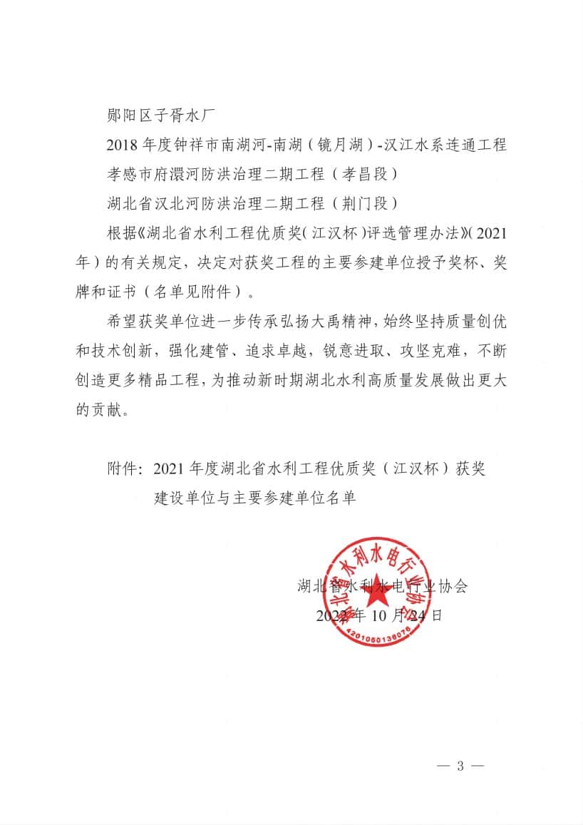 湖北省水利水电行业协会2022年10月24日以鄂水协〔2022〕17号发文“关于颁发2021年度湖北省水利工程优质奖(江汉杯)的决定"。经湖北省水利水电工程优质奖(江汉杯)评选委员会评选,经公示,确定南水北调中线一期引江济汉工程等28个工程荣获2021年度湖北省水利工程优质奖(江汉杯)。公司参建的南水北调中线一期引江济汉工程、襄阳东津新区水系治理工程、房县方家畈水库工程3个项目入围并获此荣誉,在此表示祝贺,感谢以上项目所有参建人员的辛勤付出。同时号召公司所有员工向他们学习,争先创优,期待取得更大的辉煌。