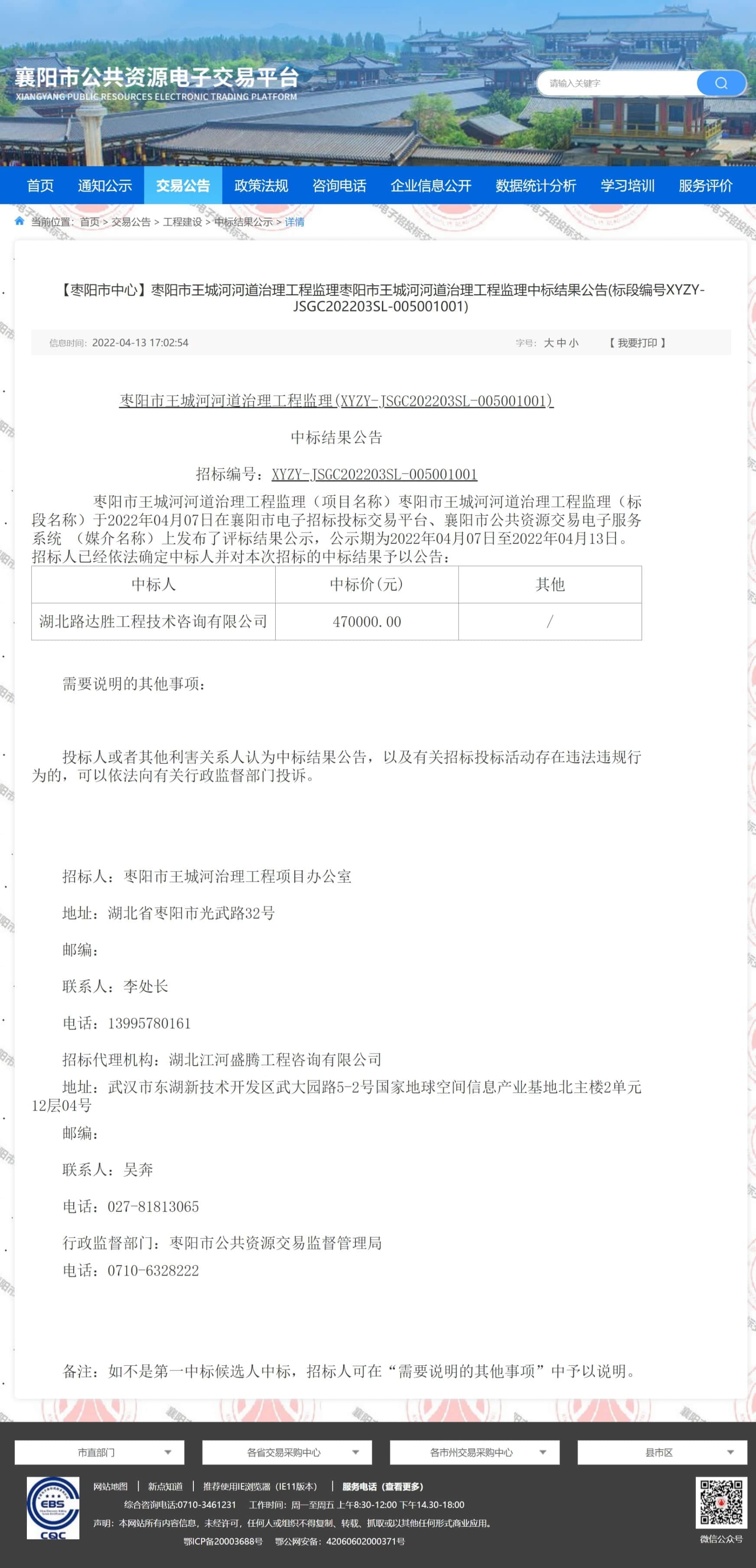 枣阳市王城河河道治理工程监理(项目名称)枣阳市王城河河道治理工程监理(标段名称)于2022年04月07日在襄阳市电子招标投标交易平台、襄阳市公共资源交易电子服务系统 (媒介名称)上发布了评标结果公示,公示期为2022年04月07日至2022年04月13日。招标人已经依法确定中标人并对本次招标的中标结果予以公告: