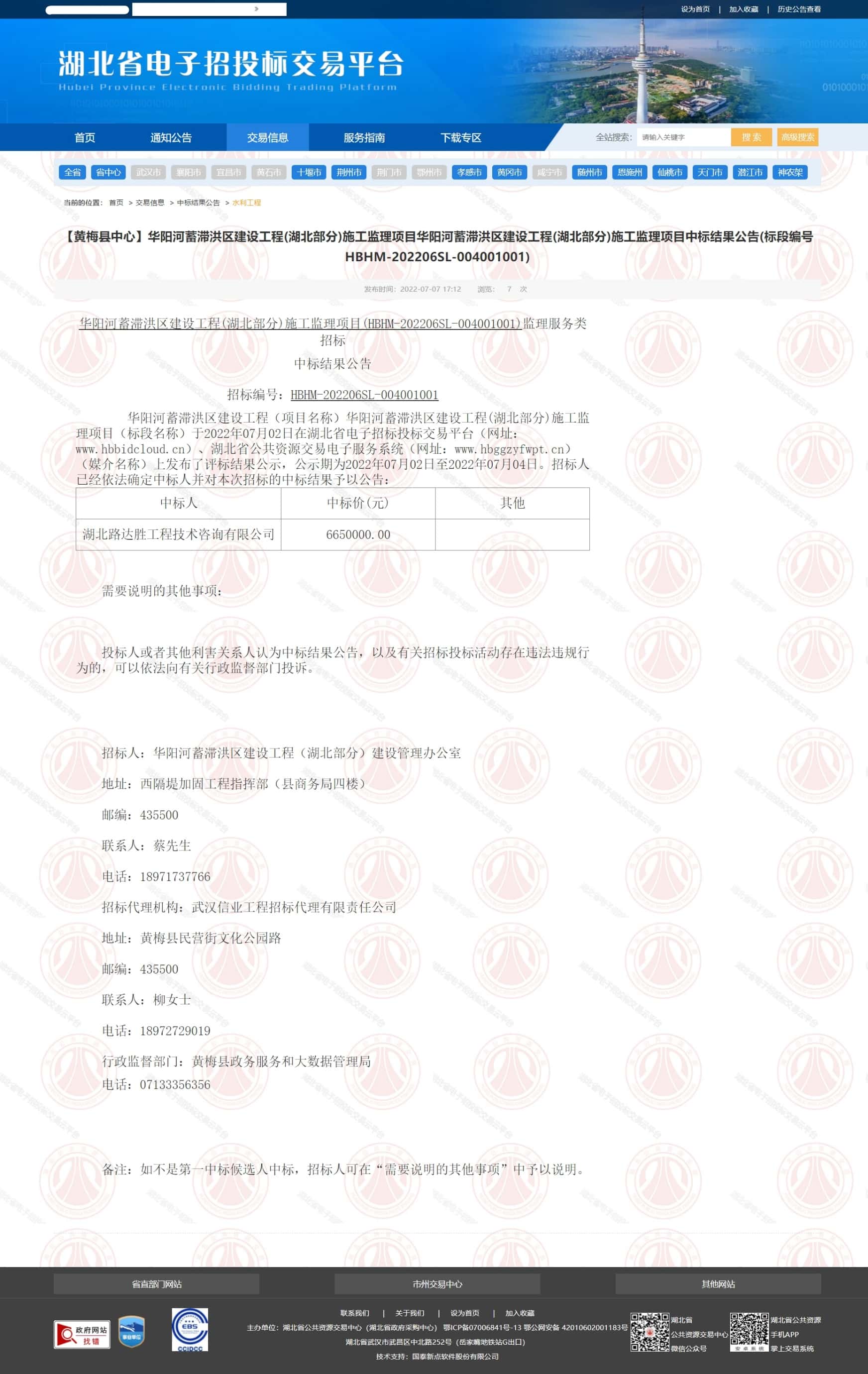 华阳河蓄滞洪区建设工程(项目名称)华阳河蓄滞洪区建设工程(湖北部分)施工监理项目(标段名称)于2022年07月02日在湖北省电子招标投标交易平台(网址:www.hbbidcloud.cn)、湖北省公共资源交易电子服务系统(网址:www.hbggzyfwpt.cn)(媒介名称)上发布了评标结果公示,公示期为2022年07月02日至2022年07月04日。招标人已经依法确定中标人并对本次招标的中标结果予以公告: